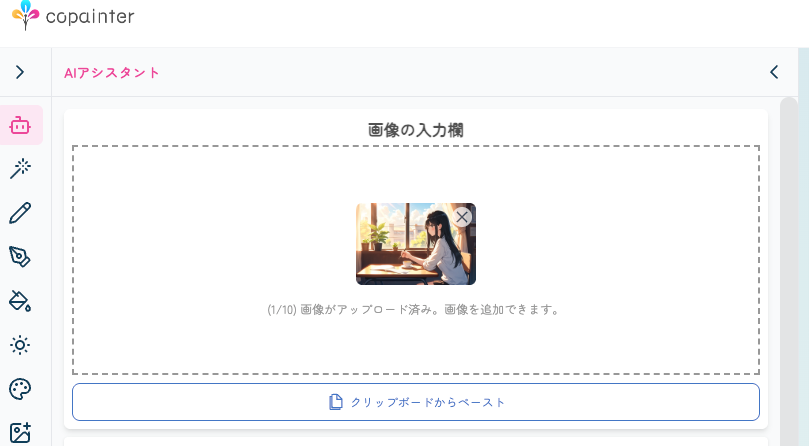 copainterのAIアシスタント機能は、誰でも簡単に使えるように設計されています。複雑な設定や専門知識は不要で、イラストをアップロードして指示を入力するだけ。あとはAIが自動でアシストしてくれます。