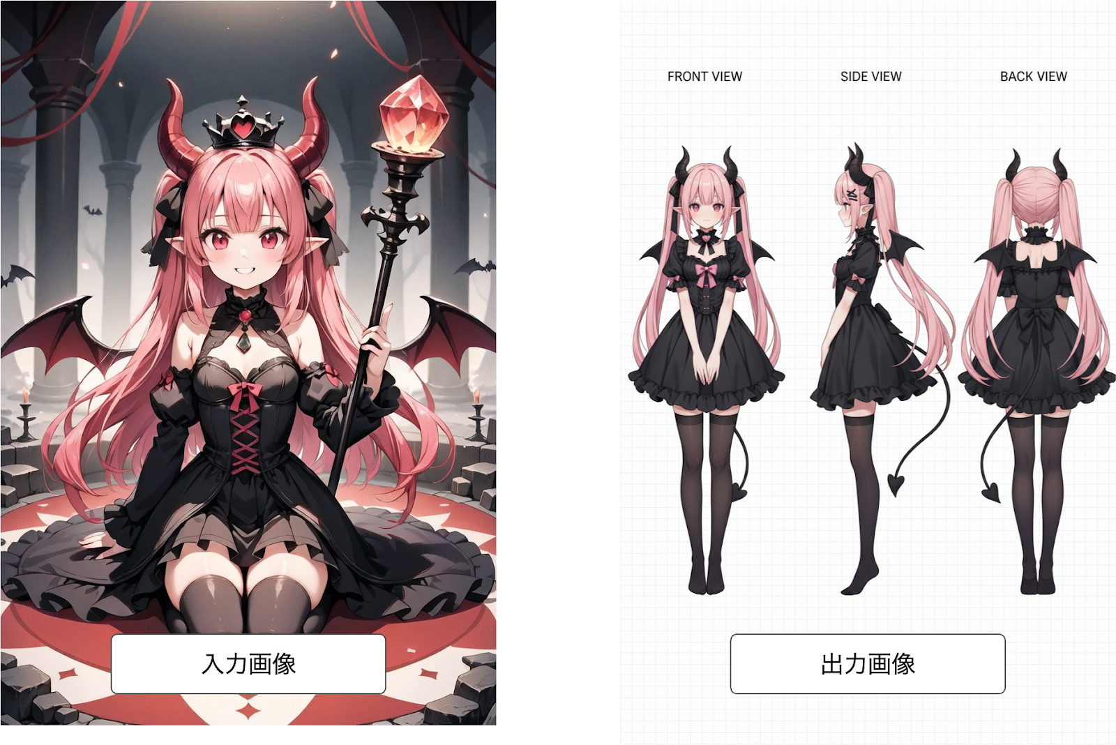 ゲームやアニメ制作で欠かせない、キャラクターの「表情差分」や「三面図」といった手間のかかる作業をAIが強力にアシスト。AIモデルは「nano banana」を搭載しているため、ラフ画を元にしたポーズ変更なども得意です。