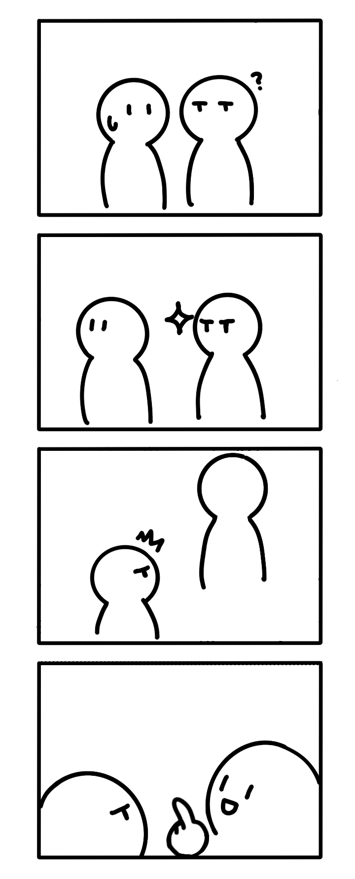 このネームを縦長の4コママンガの完成原稿にして。テキストや描き文字は無し。