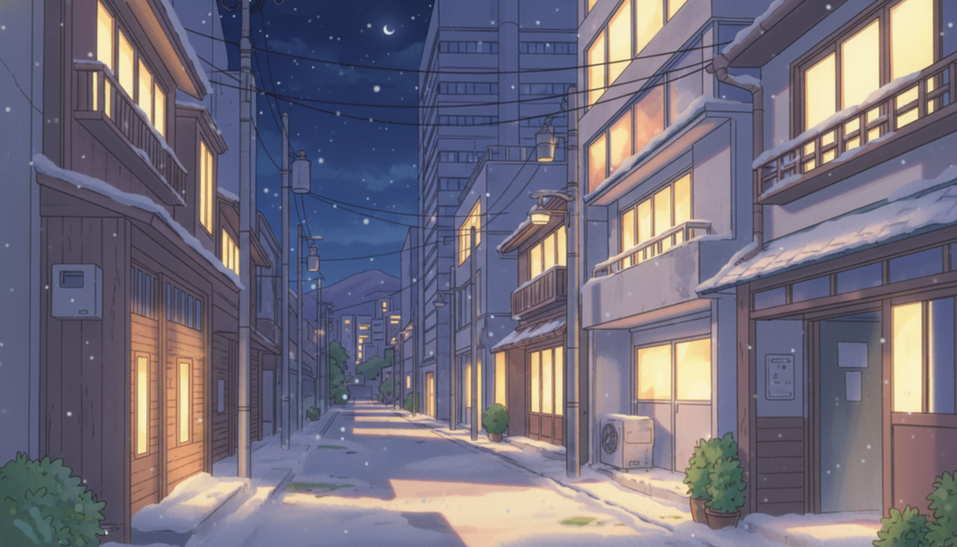 使用プロンプト:画像の季節を冬に、時間帯を夜に変更して。カラーリングも合わせて。地面に雪を足して。