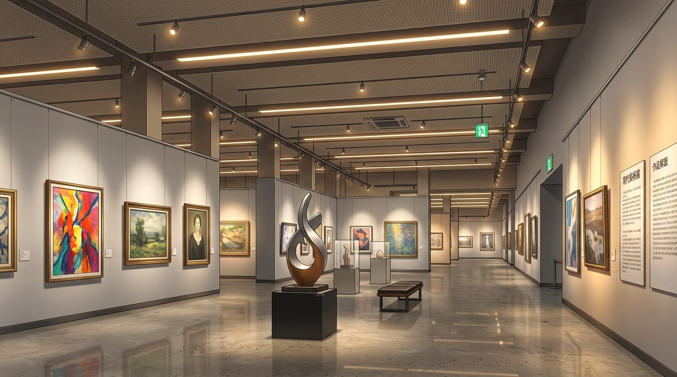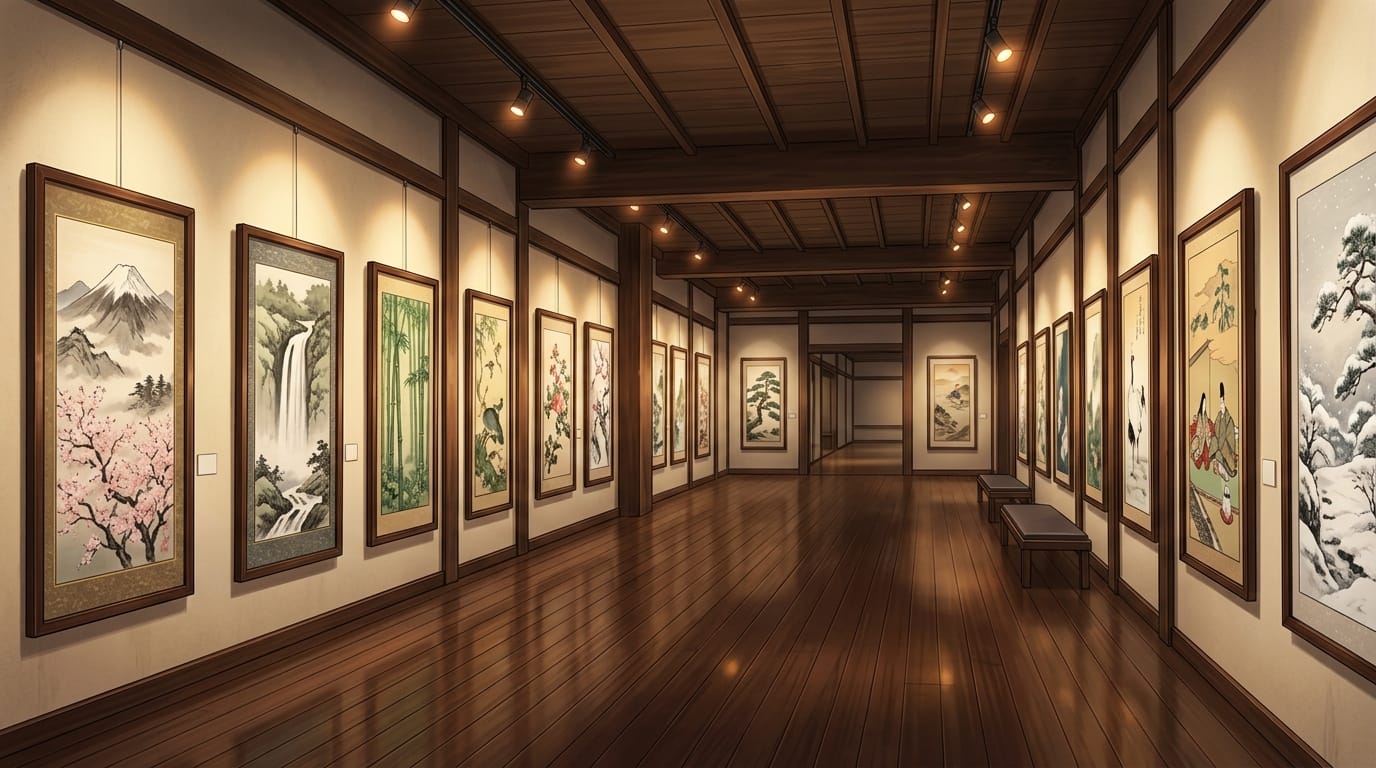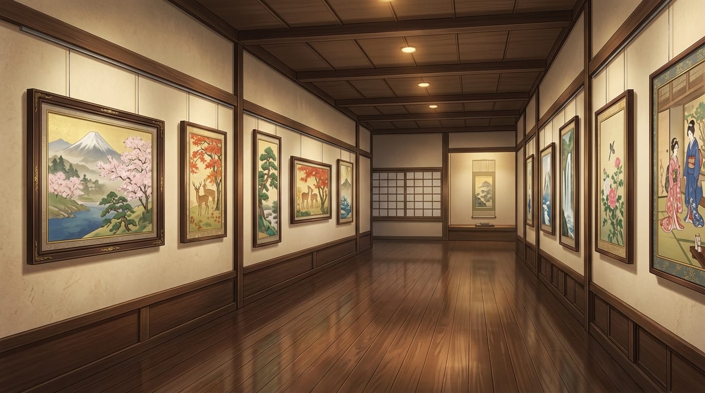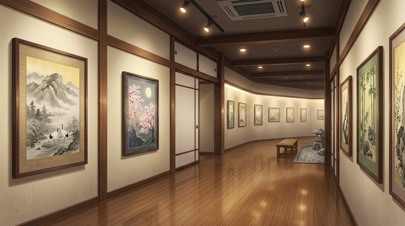 和風美術館の展示通路と日本画コレクション|和室ギャラリーの背景