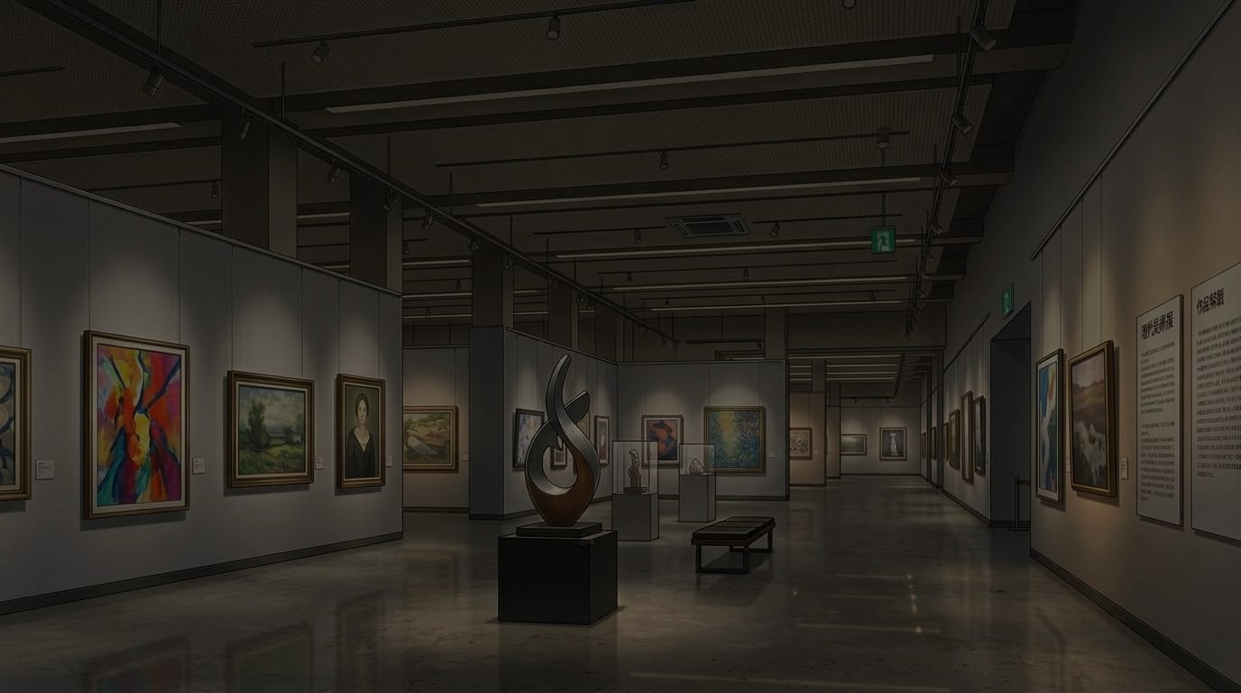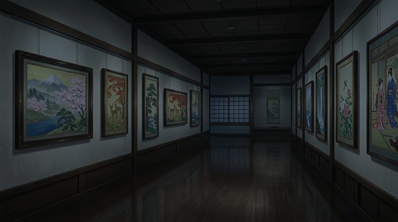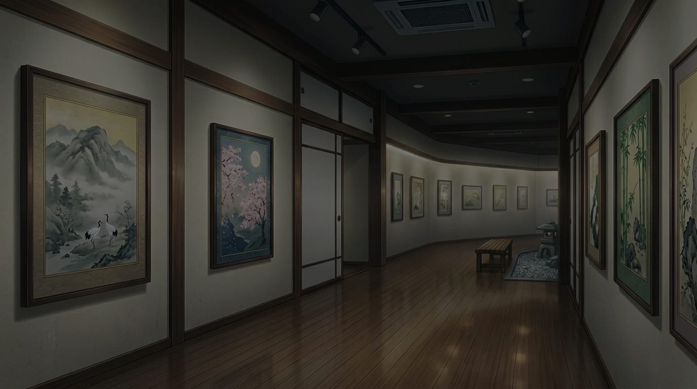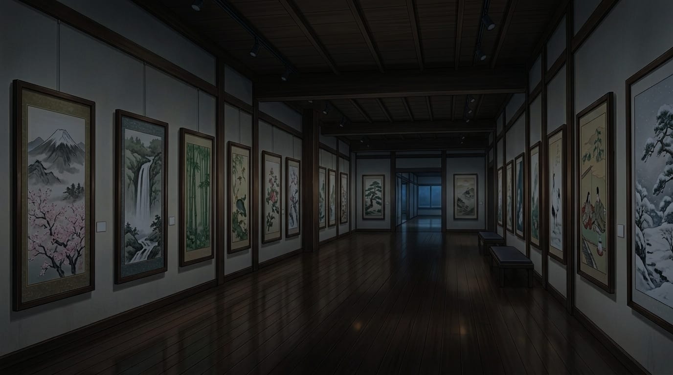 夜の和風美術館展示通路と日本画コレクション|和室ギャラリーの暗め背景
