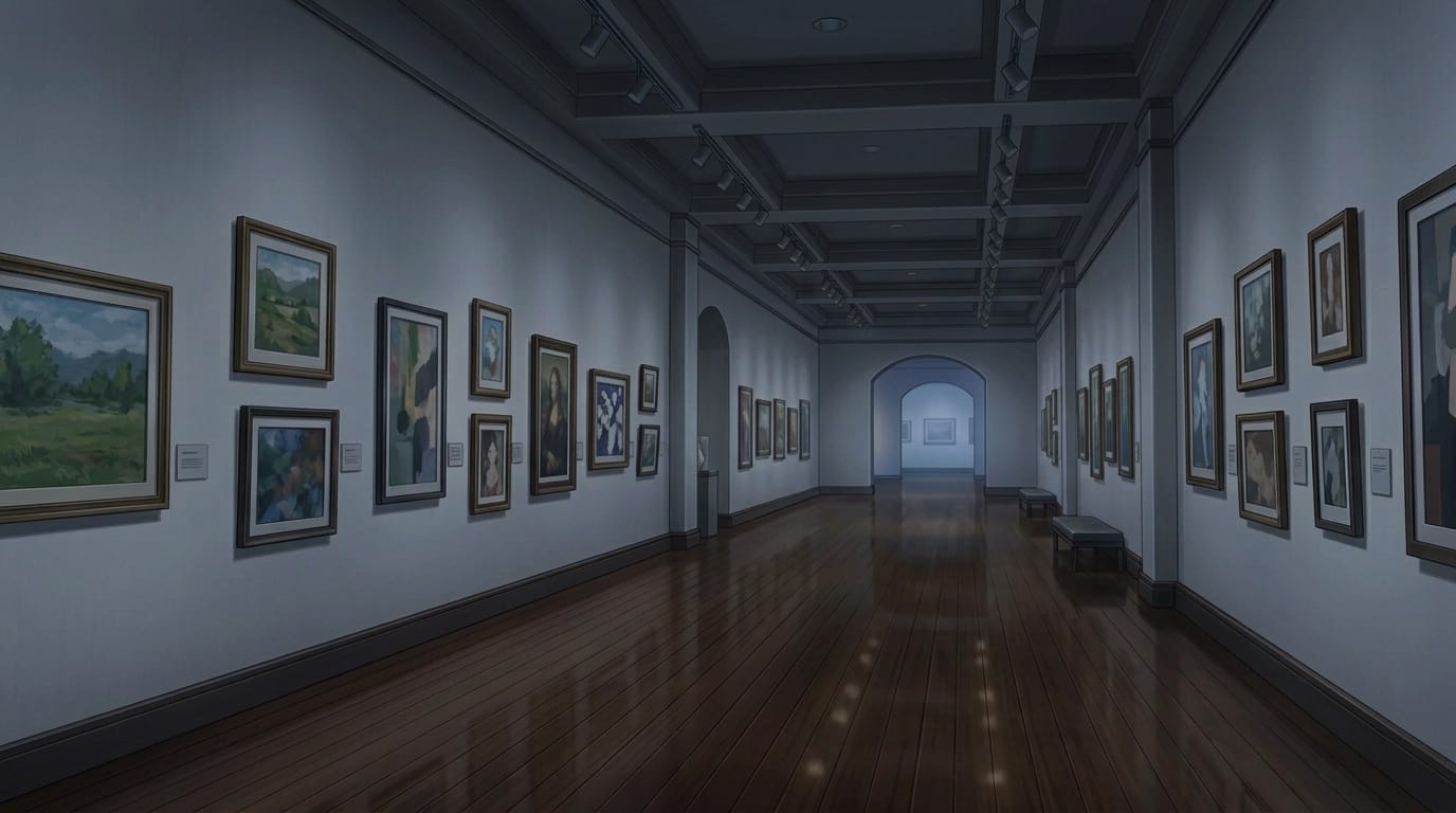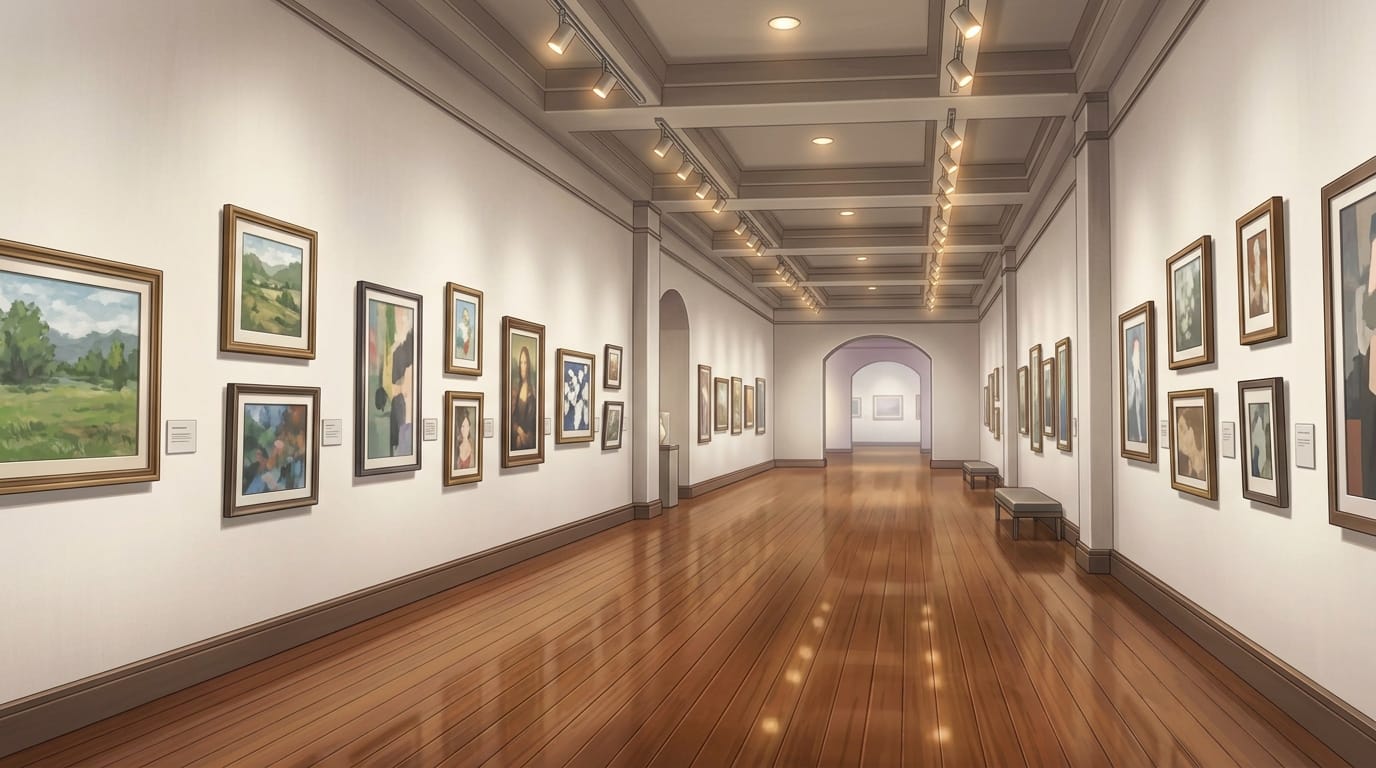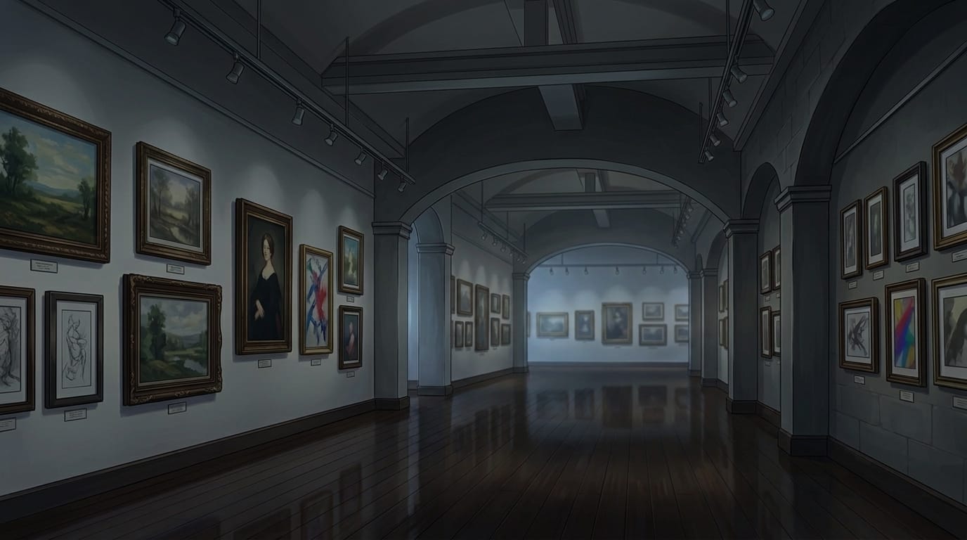 美術館の背景イラスト素材を無料配布。16:9の横長構図でPC向け作品に使いやすい背景イラストです。漫画・Webtoonやゲーム背景として商用・トレース利用もOK!
