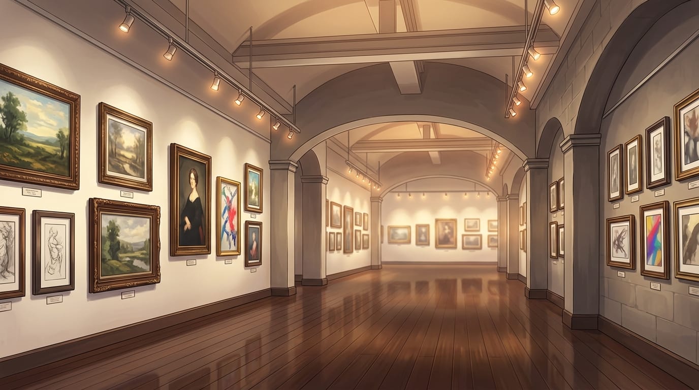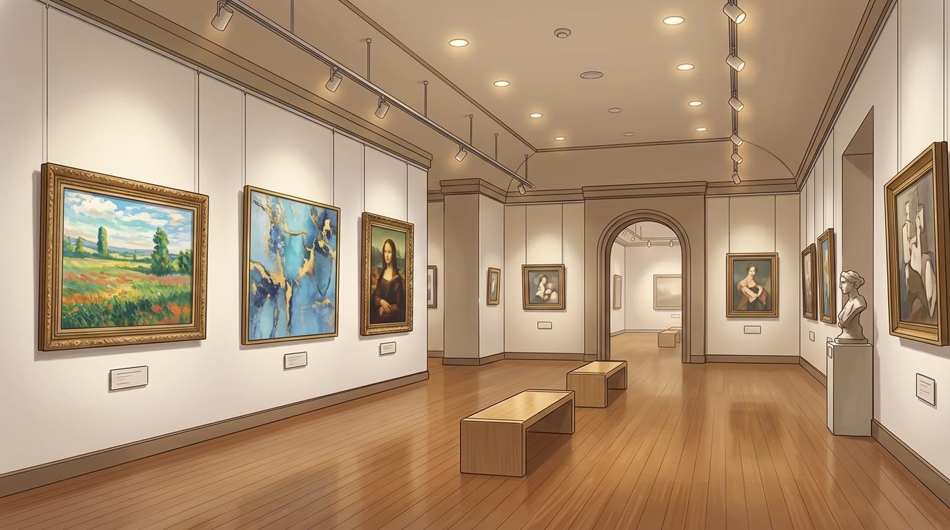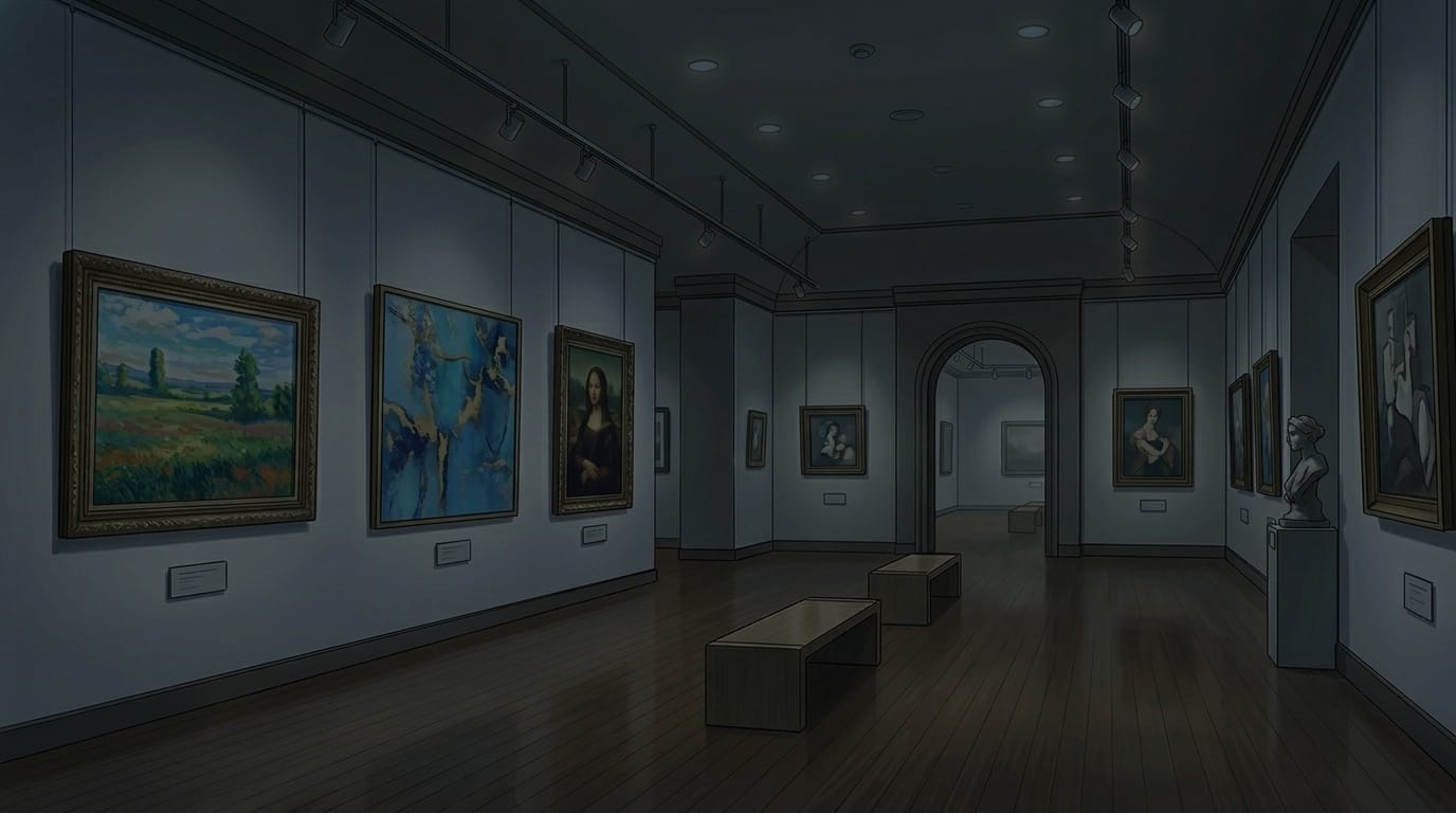 美術館の背景イラスト素材を無料配布。16:9の横長構図でPC向け作品に使いやすい背景イラストです。漫画・Webtoonやゲーム背景として商用・トレース利用もOK!