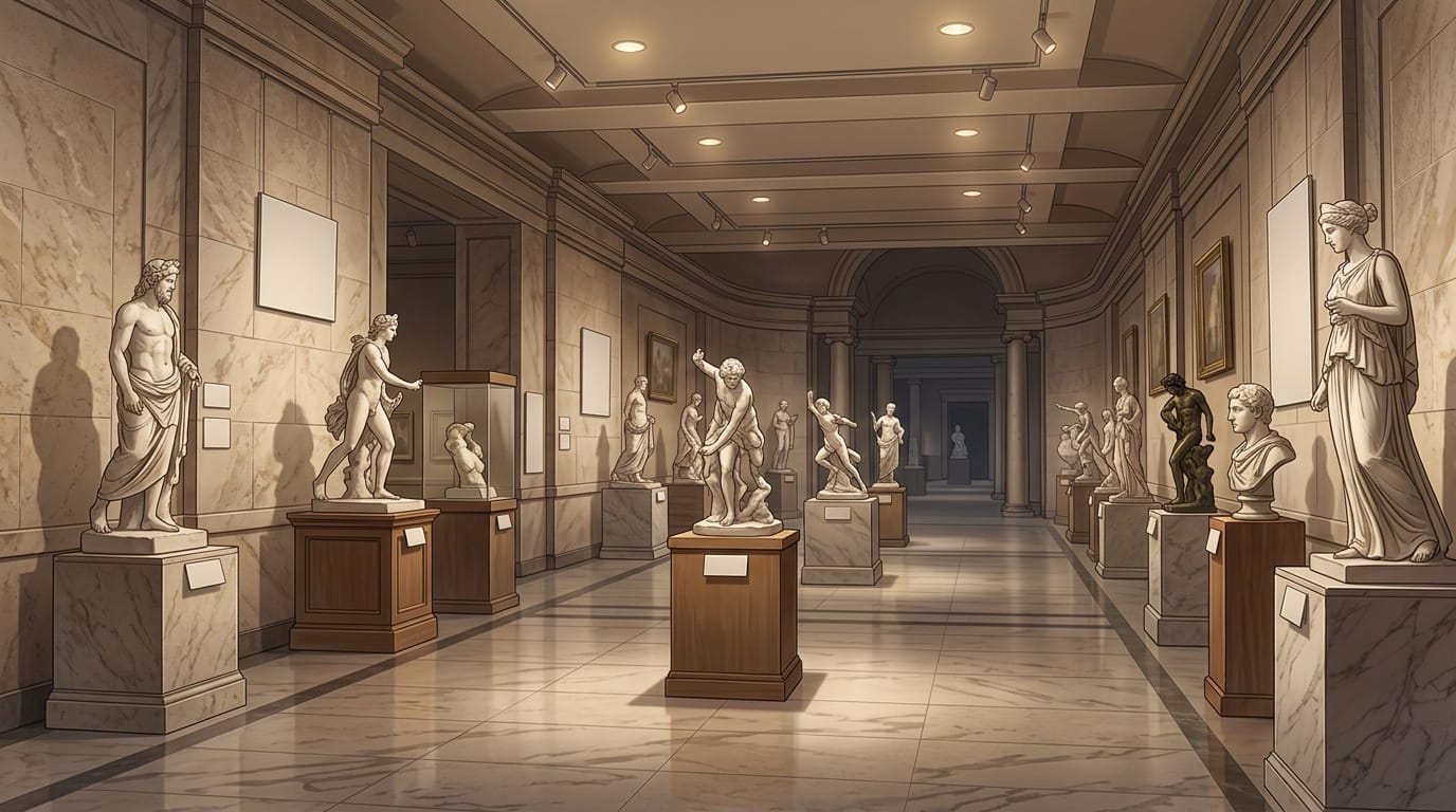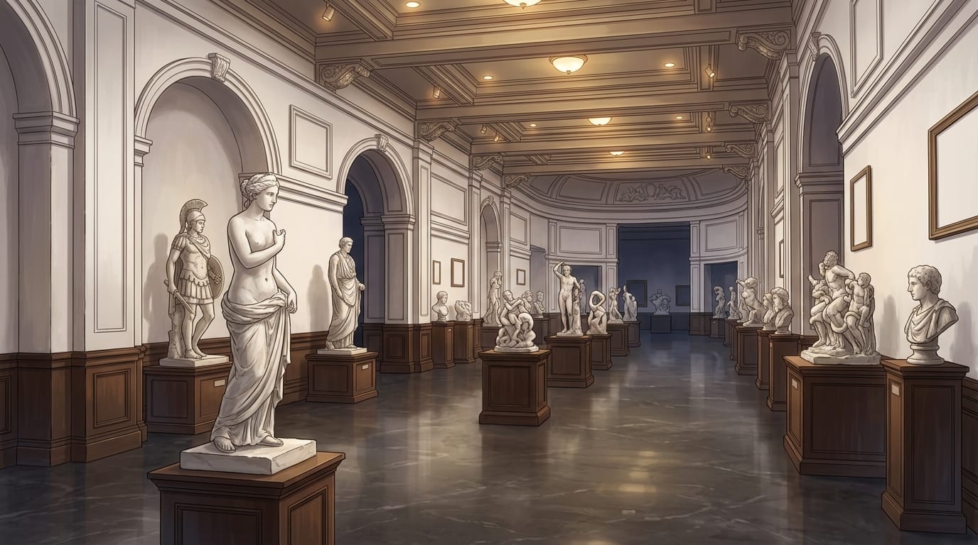 彫刻が並ぶクラシック美術館の展示ホール|彫像ギャラリーの背景