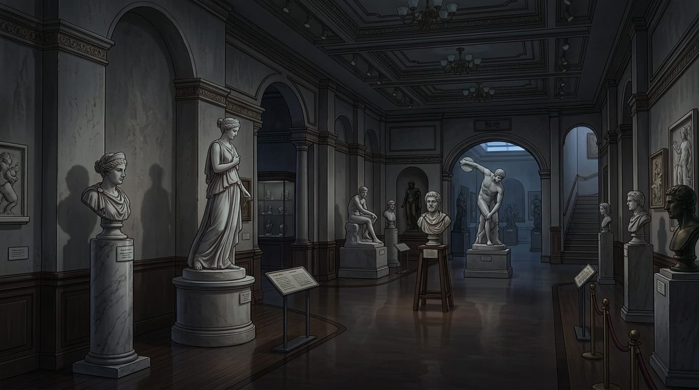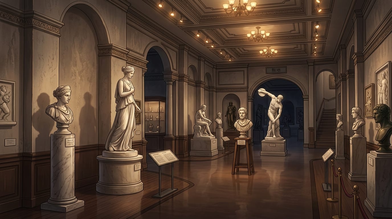 落ち着いた照明でクラシック彫刻の魅力を引き立てた展示空間の背景素材です。