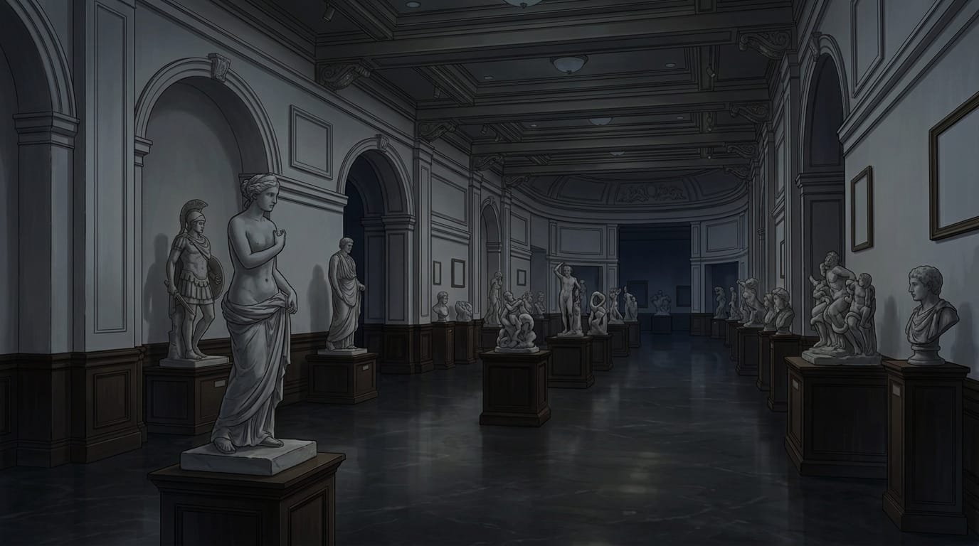 夜のクラシック美術館彫刻展示室|ギャラリーの暗め背景イラスト素材