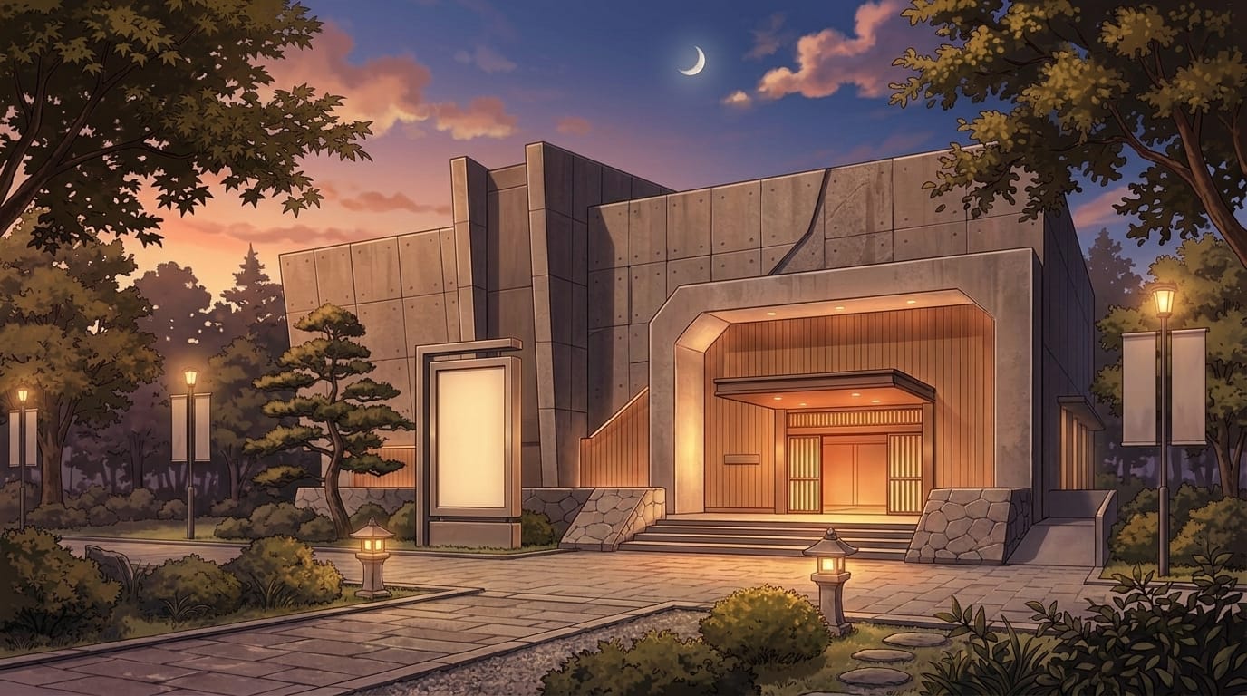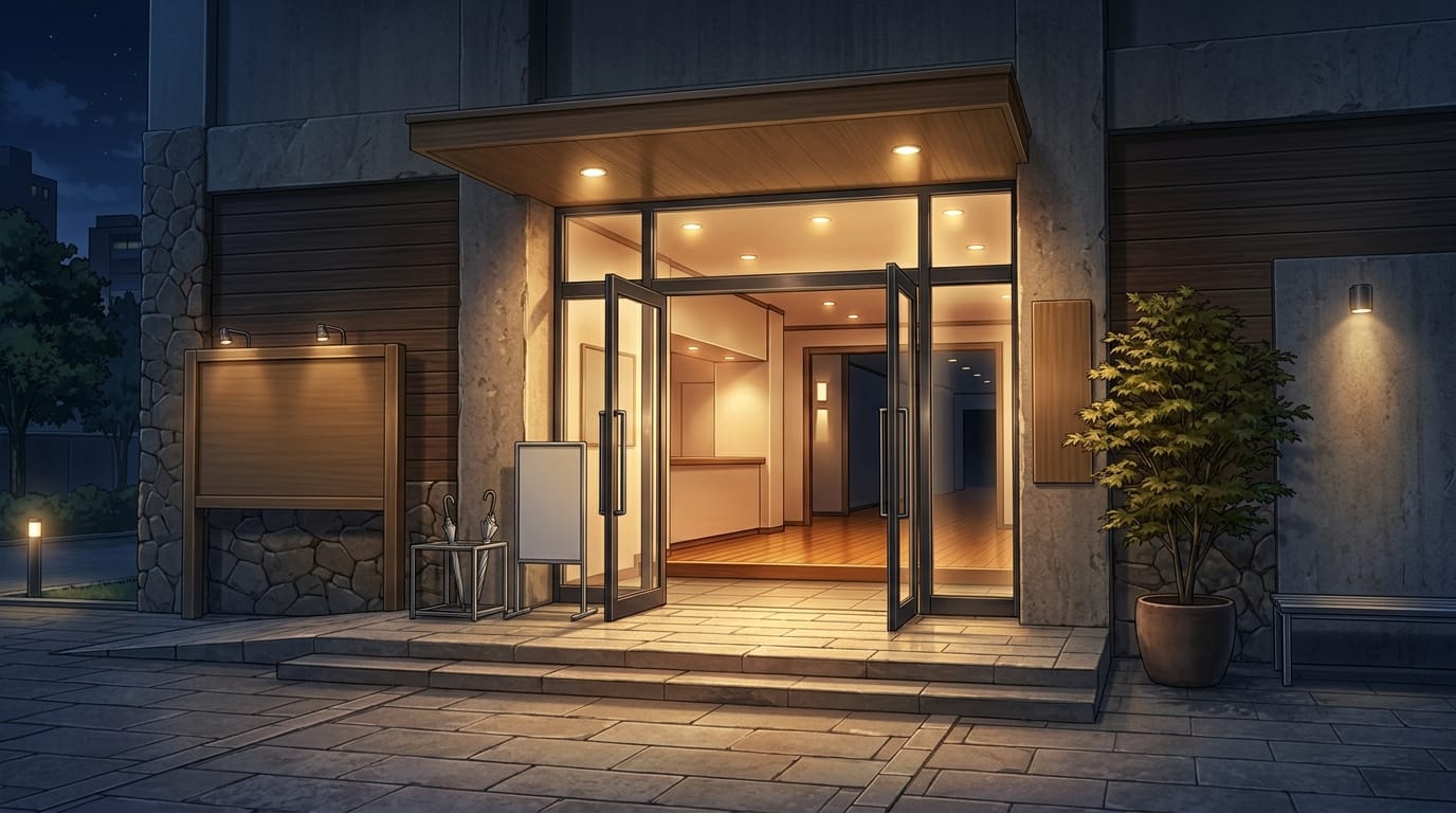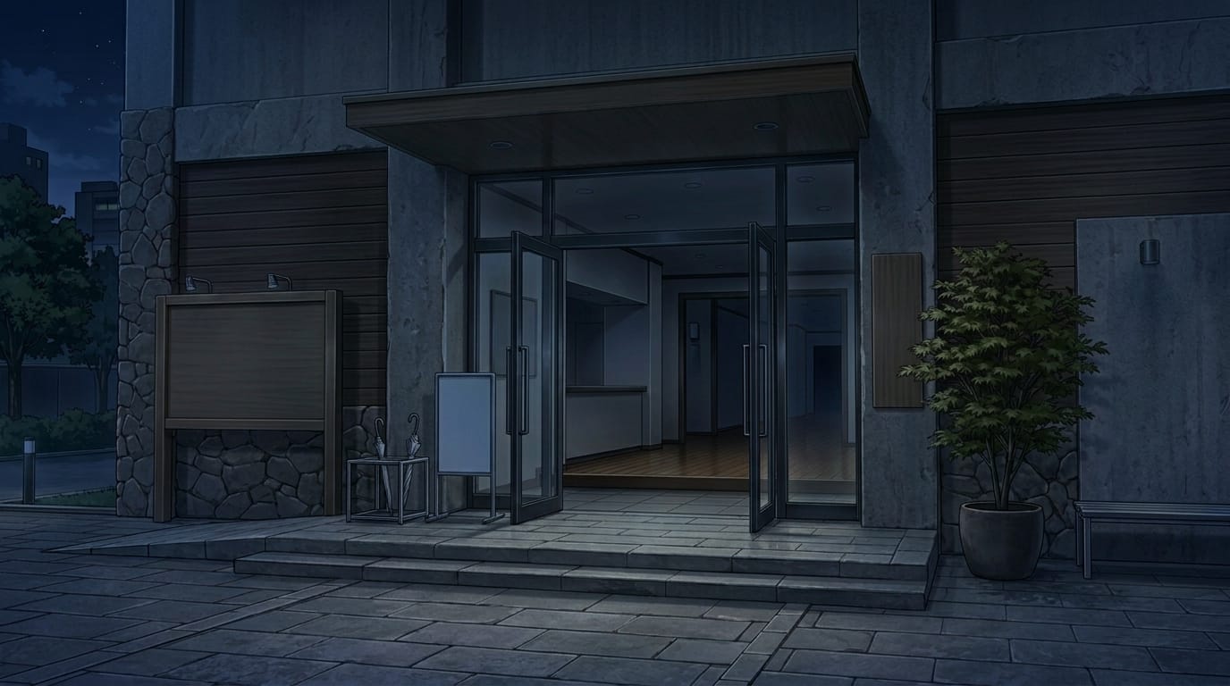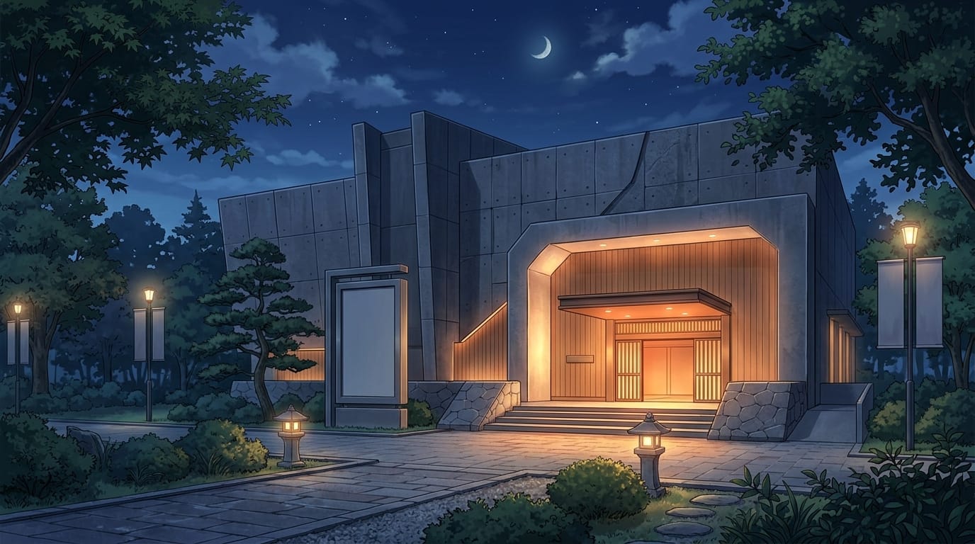 夜の静かな美術館エントランス外観|建物入口の暗め背景イラスト素材