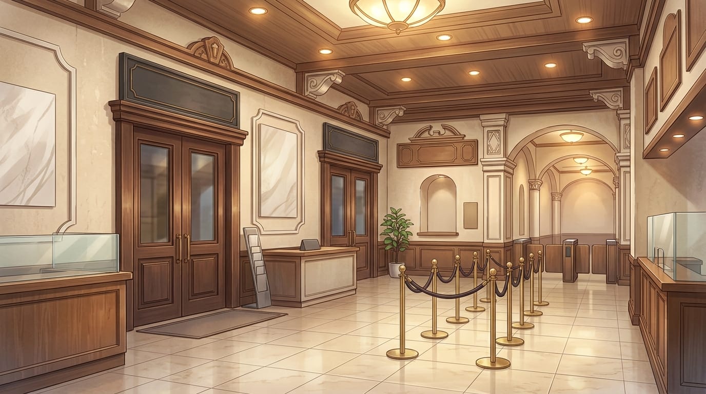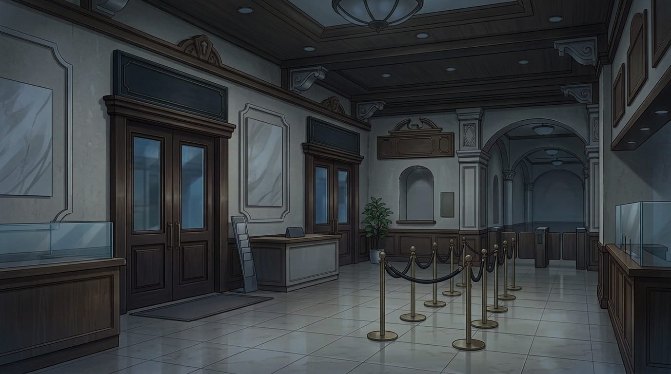 夜の美術館受付ロビーとチケットカウンター|エントランスの背景イラスト素材