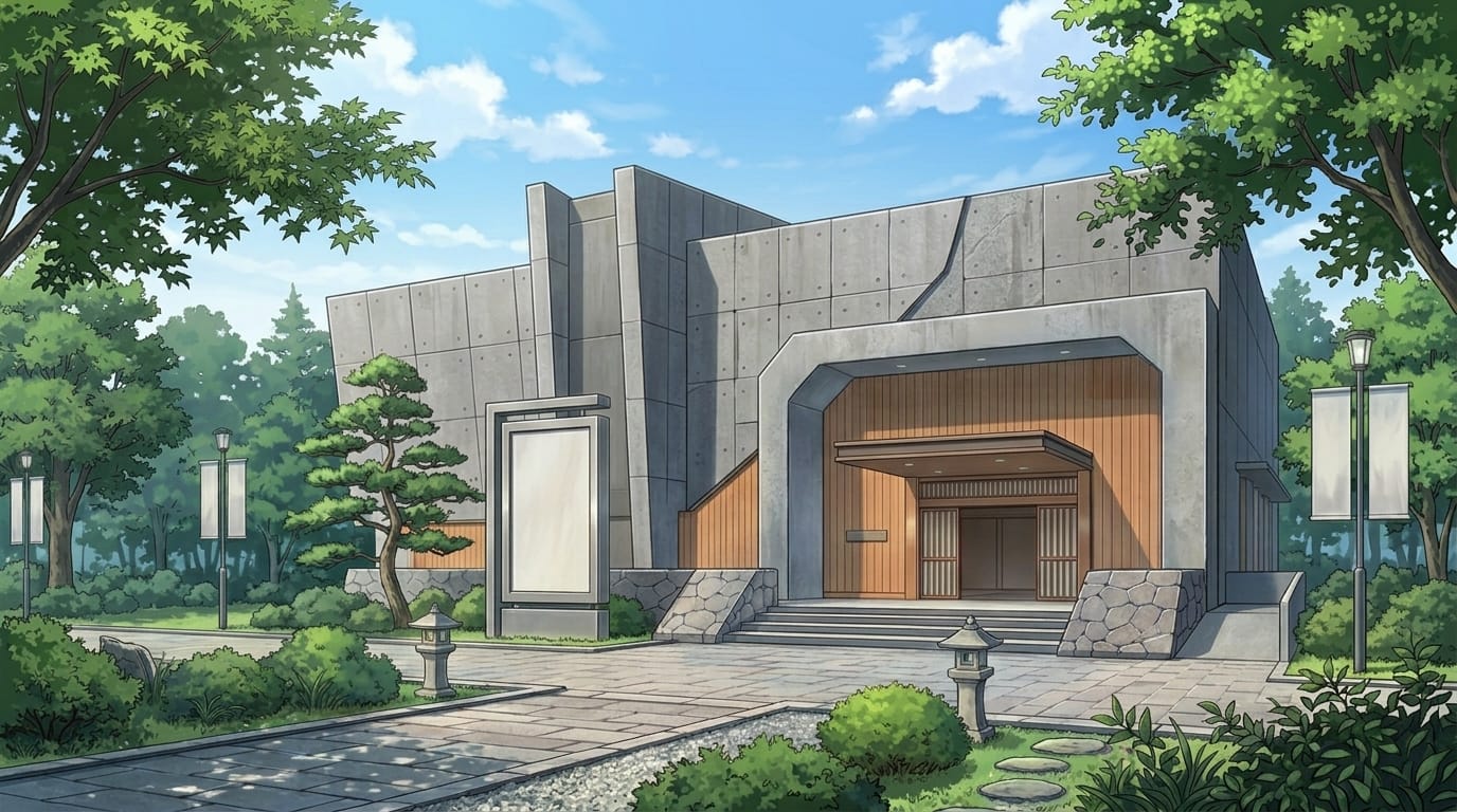 自然に囲まれた美術館の外観と庭園|建物外観の背景イラスト素材