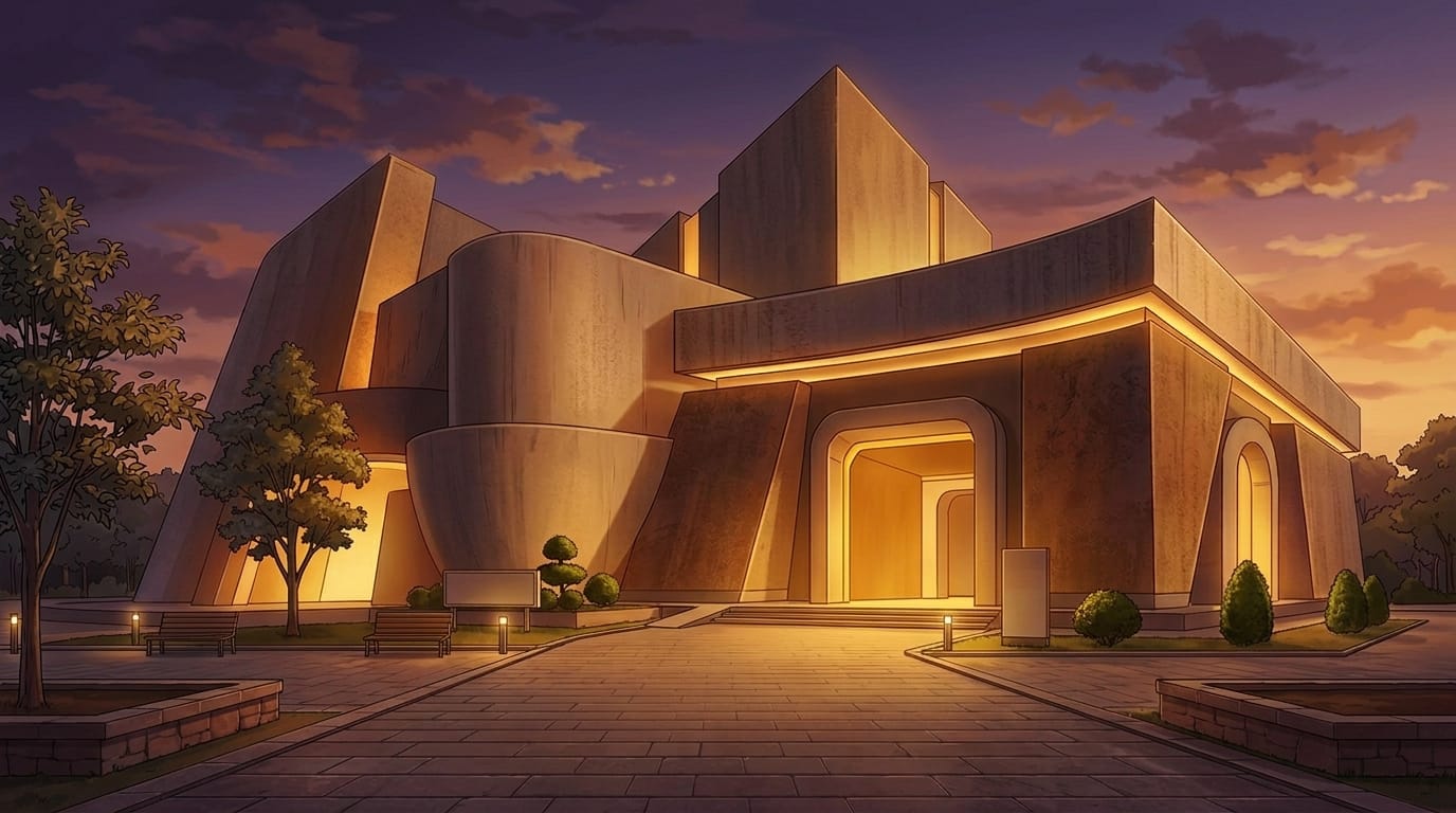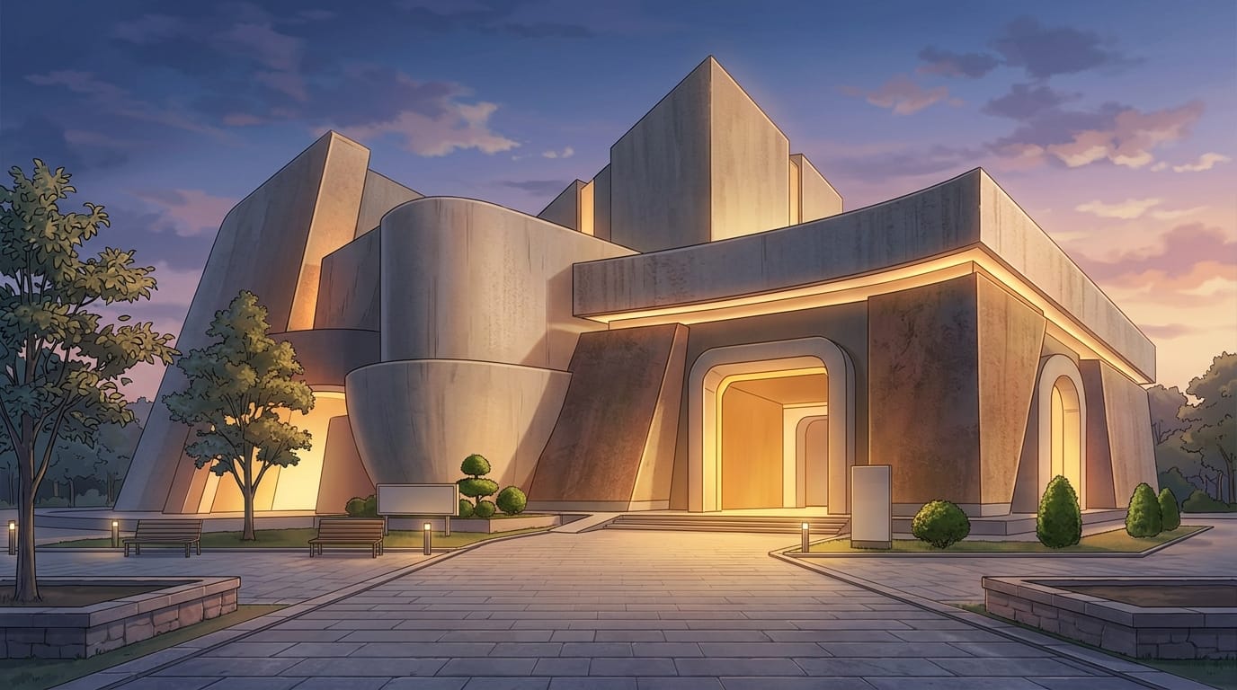 暖かい光に包まれたモダン美術館の外観を表現した背景素材です。