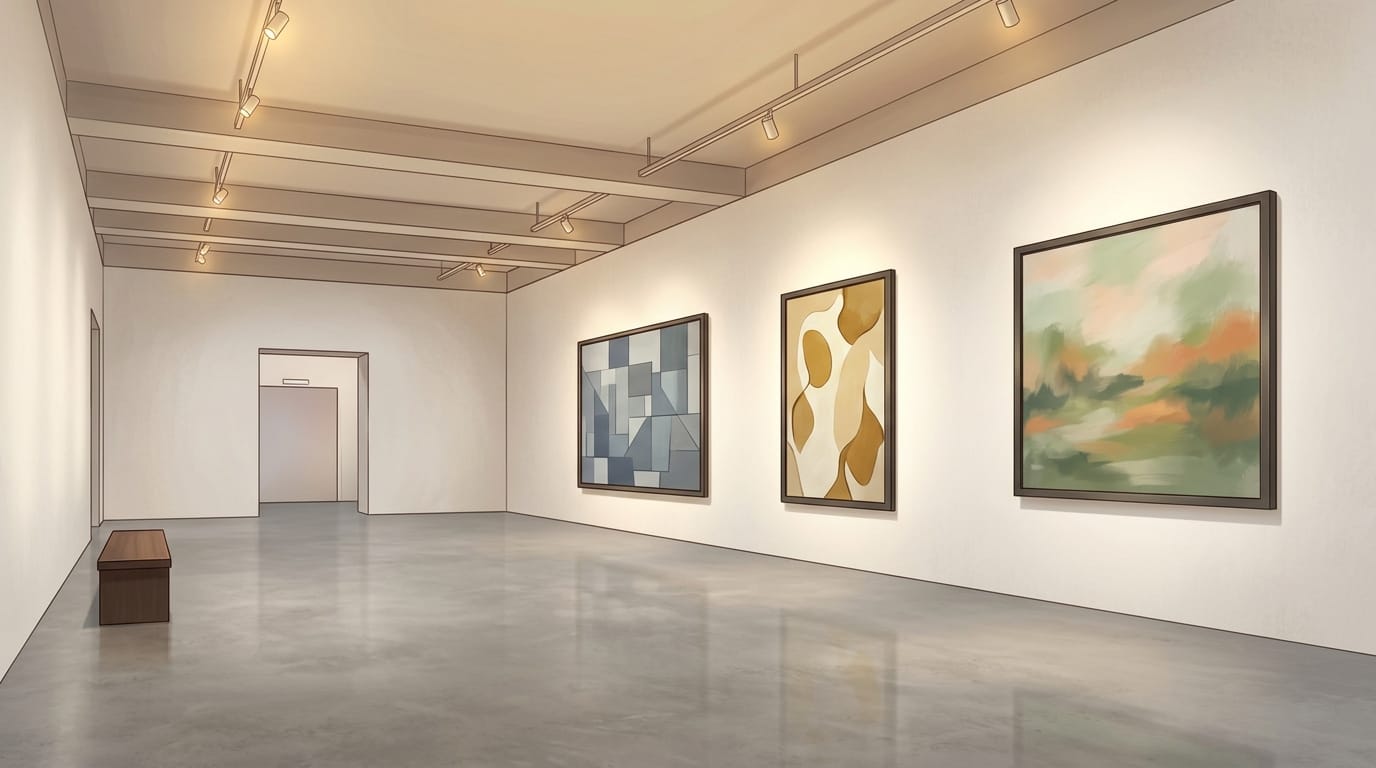 ミニマルな空間に抽象画が並ぶ現代的な展示室を描いた背景素材です。