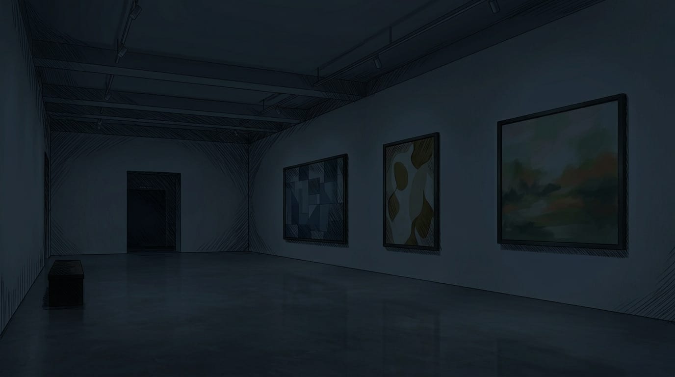 夜の現代美術館と抽象画作品|シンプルギャラリーの暗め背景イラスト素材