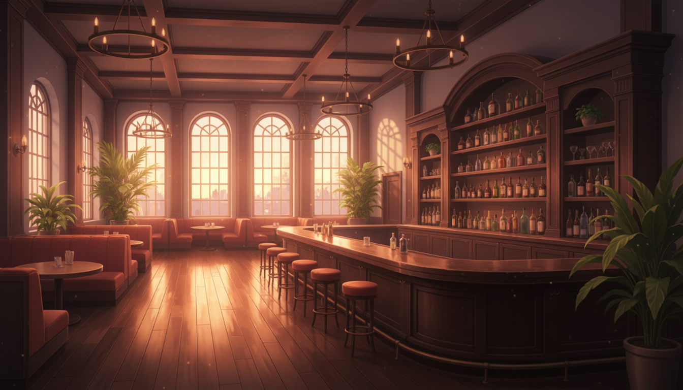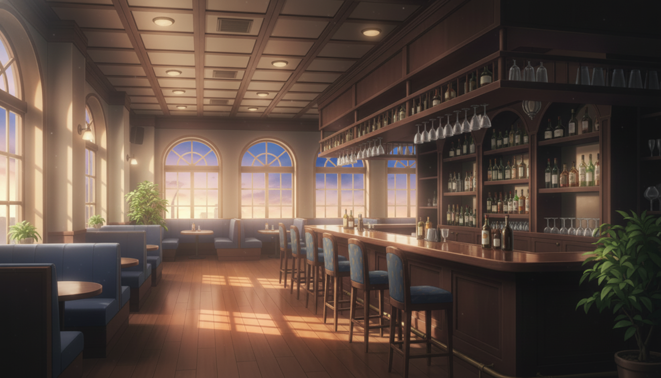 夕暮れの広間バー|柔らかな逆光と木製家具