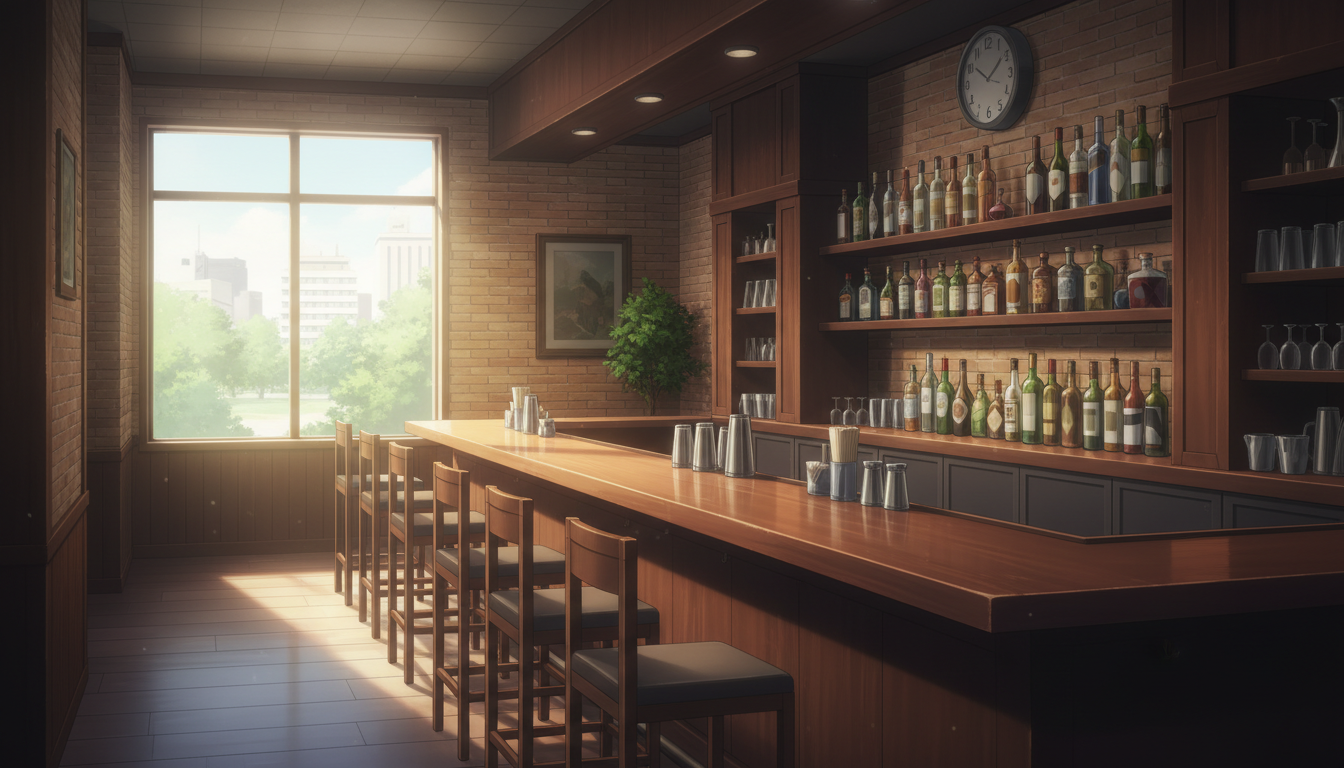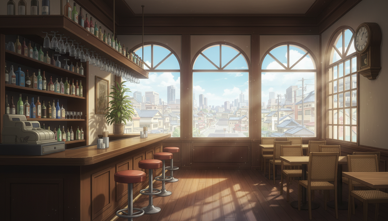 営業前の静かな時間を切り取ったような背景で、日常描写や導入に向いています。