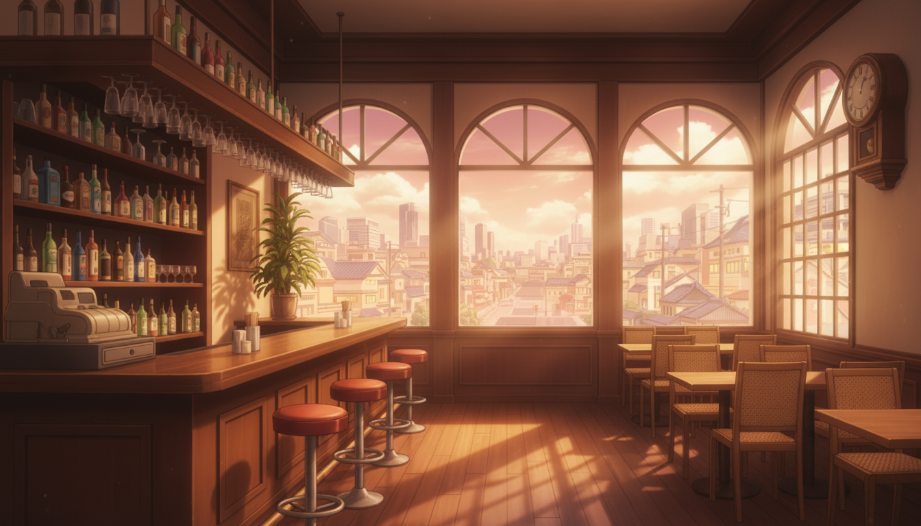 夕焼け空が店内を包み込み、一日の終わりや物語の転換点を演出する背景です。