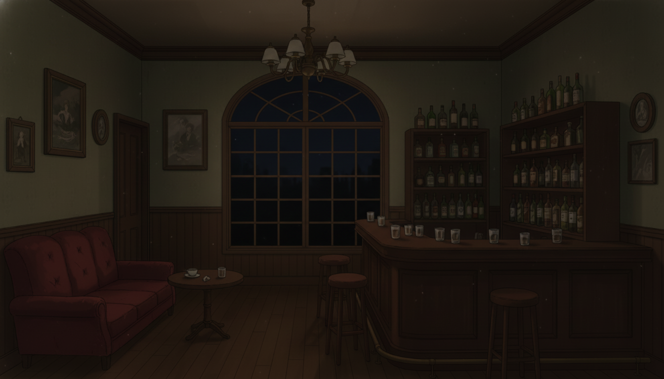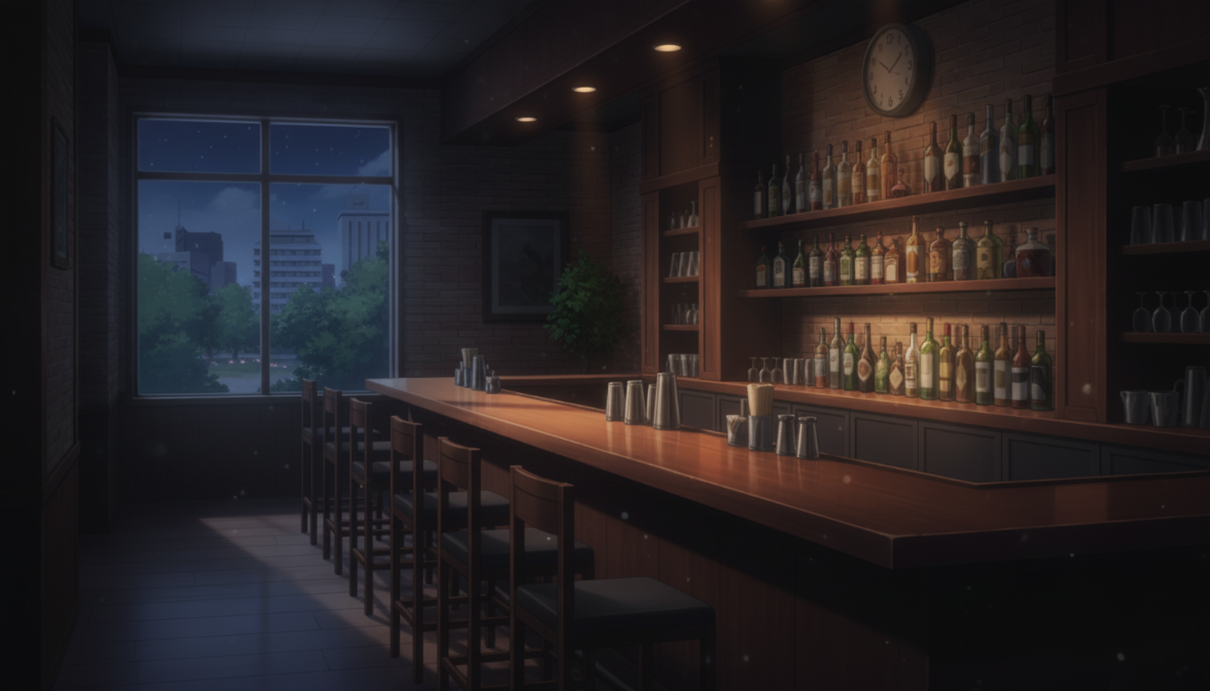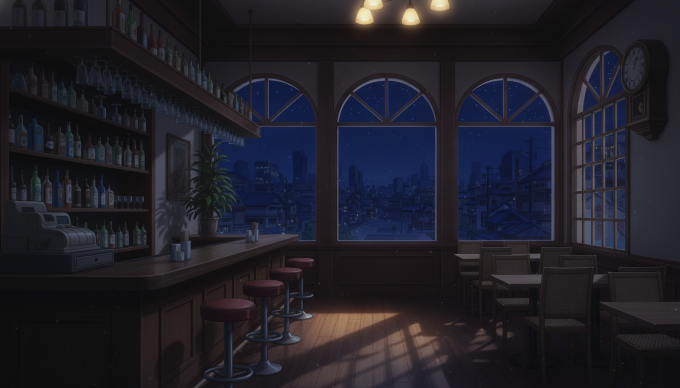 夜の街を背にした落ち着いた店内が、大人向けの物語に適した背景です。