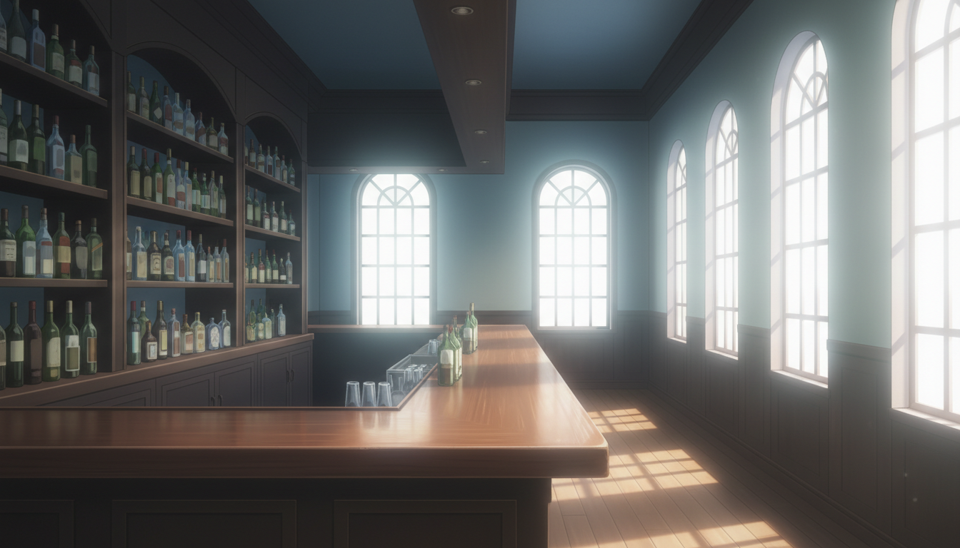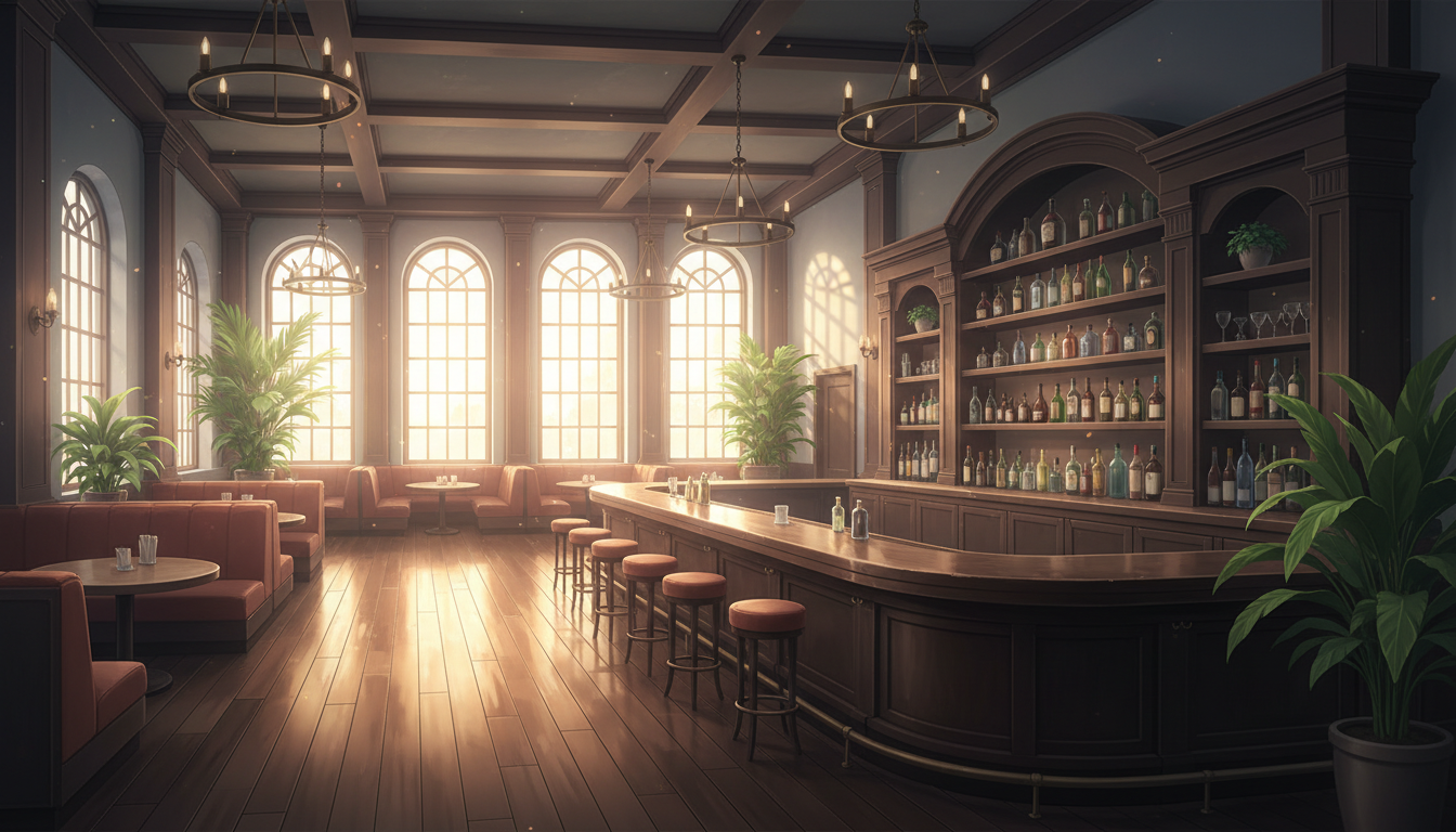 大きなアーチ窓から朝の光が差し込み、開店前や静かな導入シーンに最適なバー背景です。