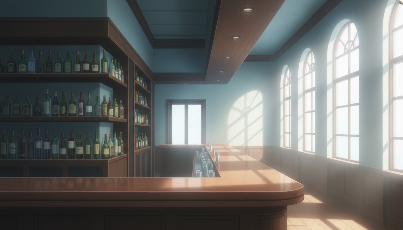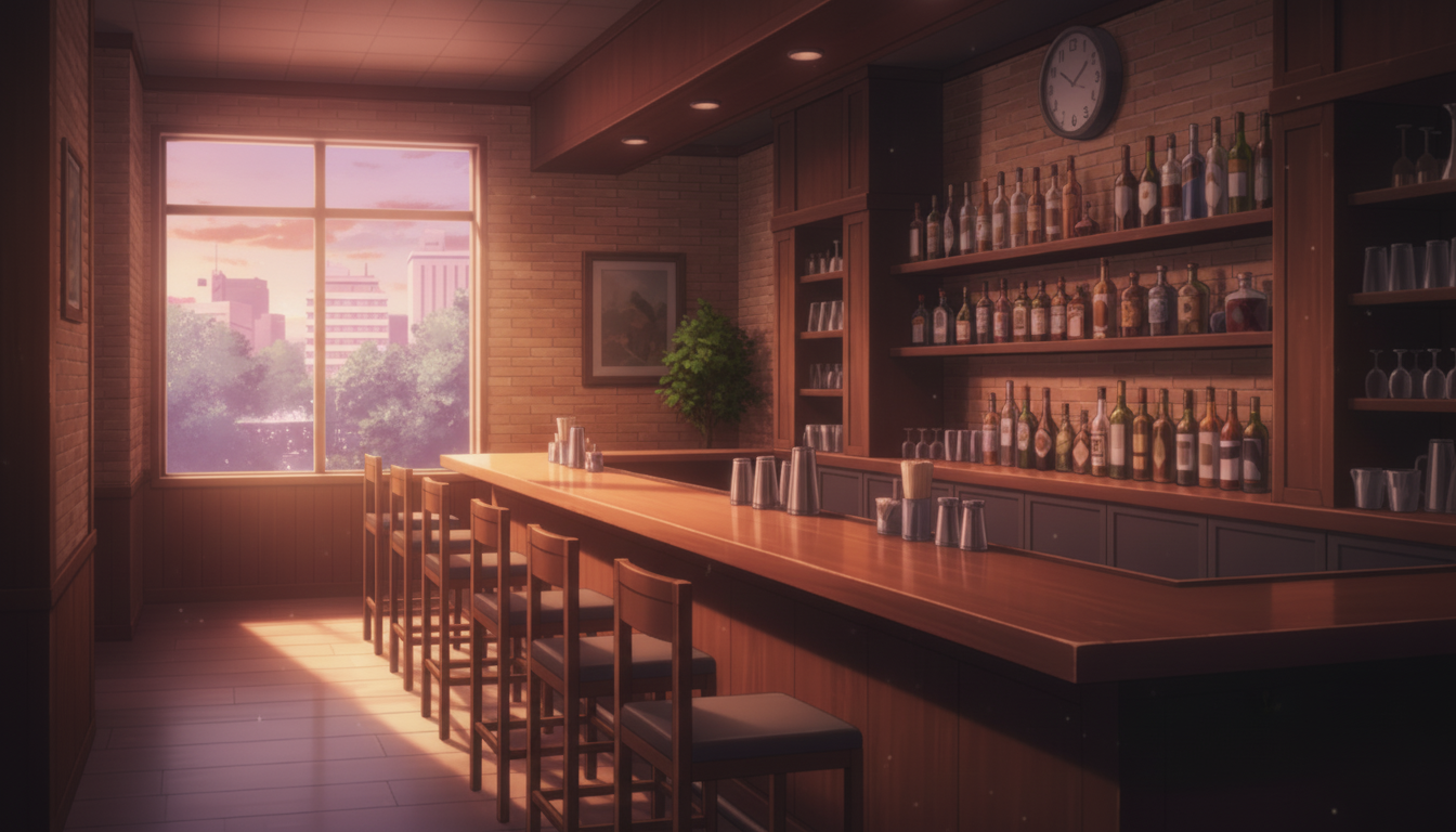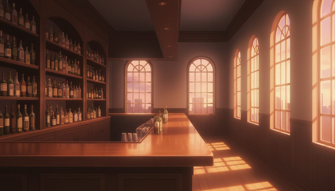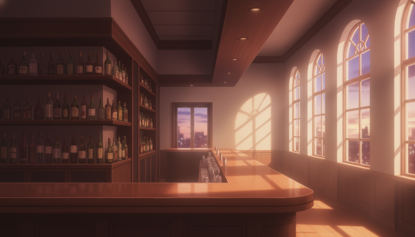 夕暮れの光が店内に伸び、一日の終わりを静かに感じさせるバー背景です。