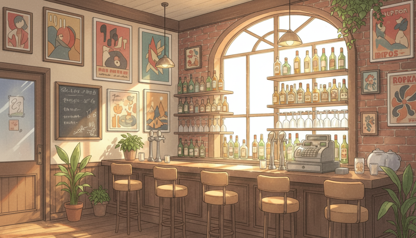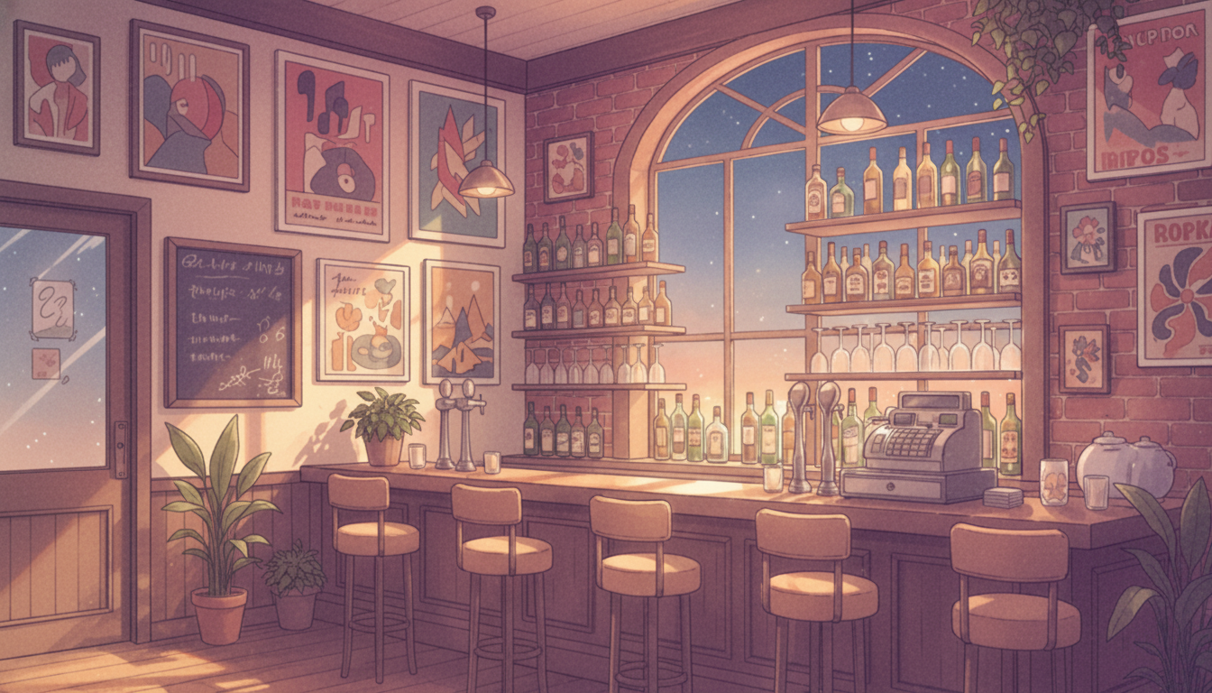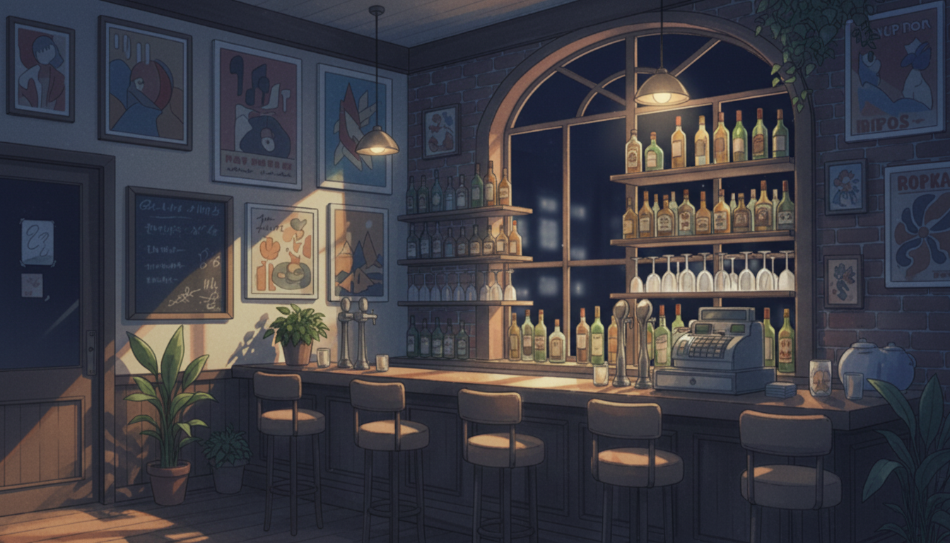 夜更けのアートバー|ポスターとボトルが並ぶ静かな店内