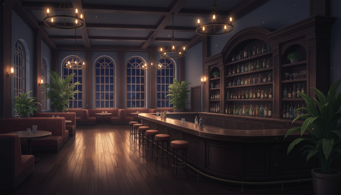 バーの背景イラスト素材を無料配布。16:9の横長構図でPC向け作品に使いやすい背景イラストです。漫画・Webtoonやゲーム背景として商用・トレース利用もOK!