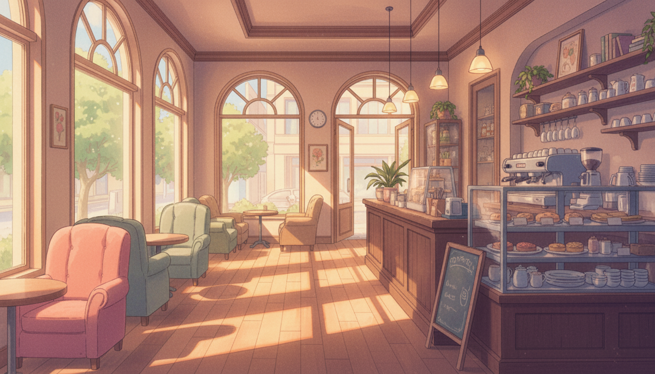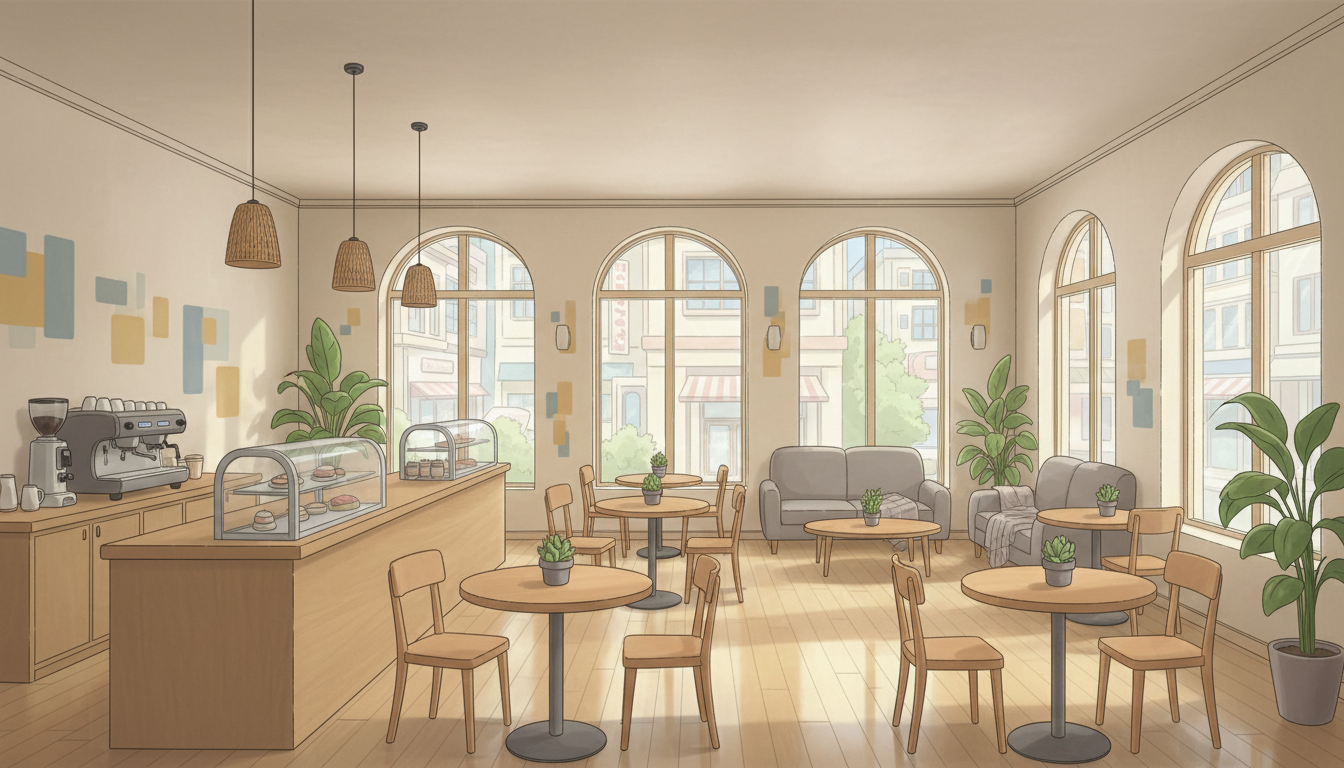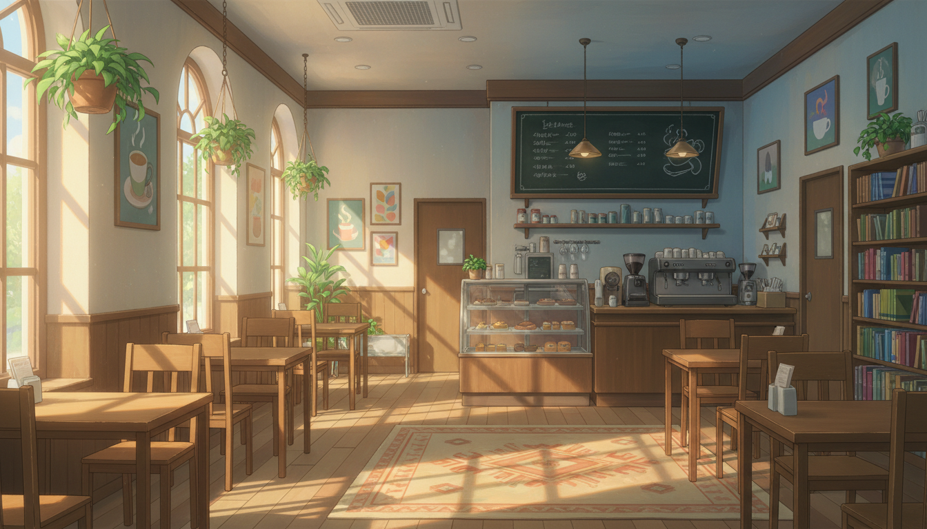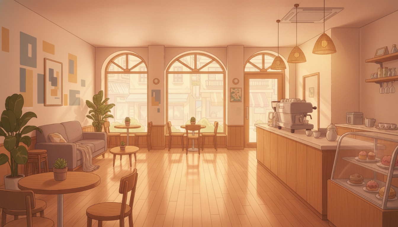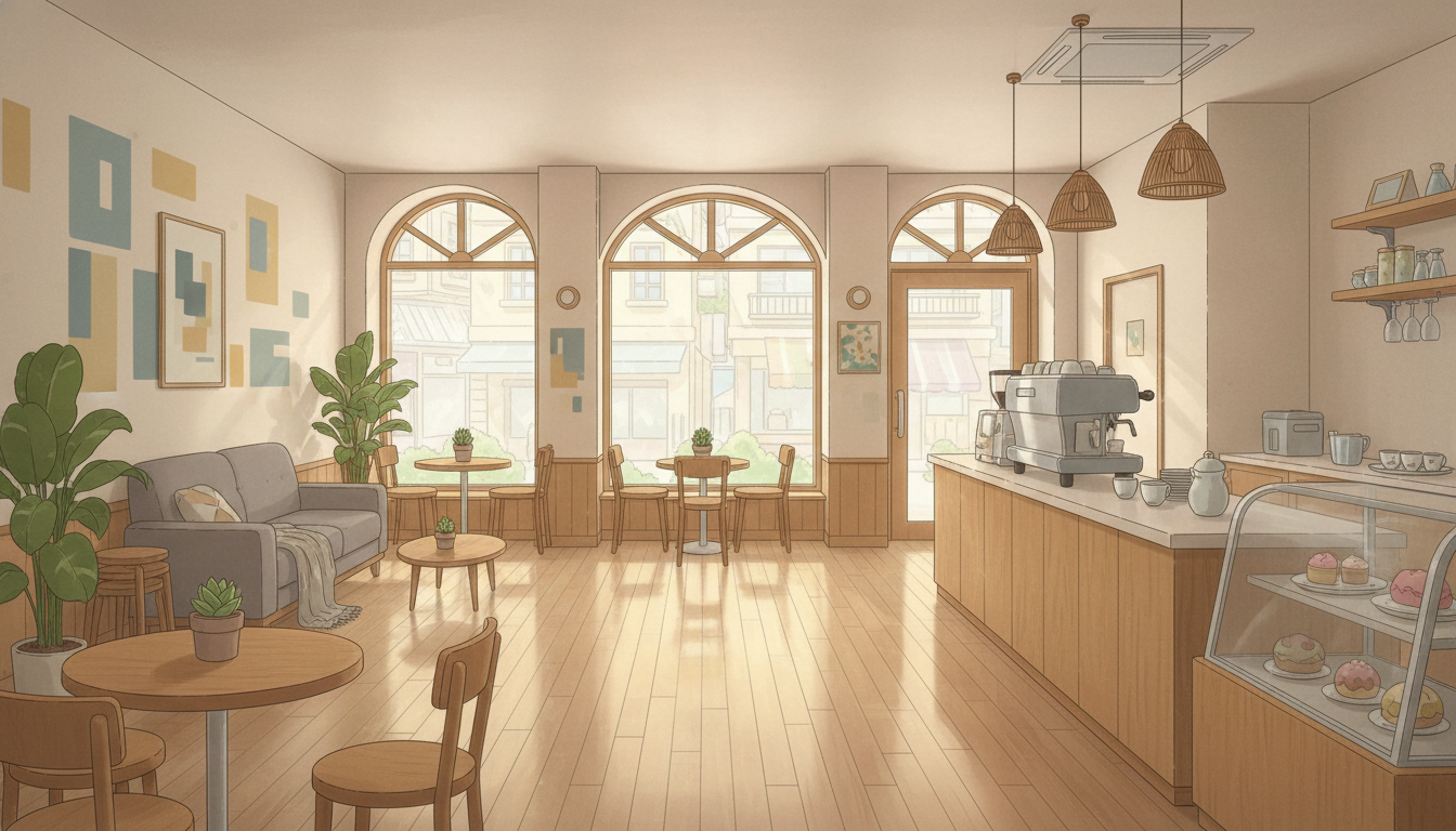 午後の柔らかな光が店内に広がり、会話や休憩シーンに最適な背景です。
