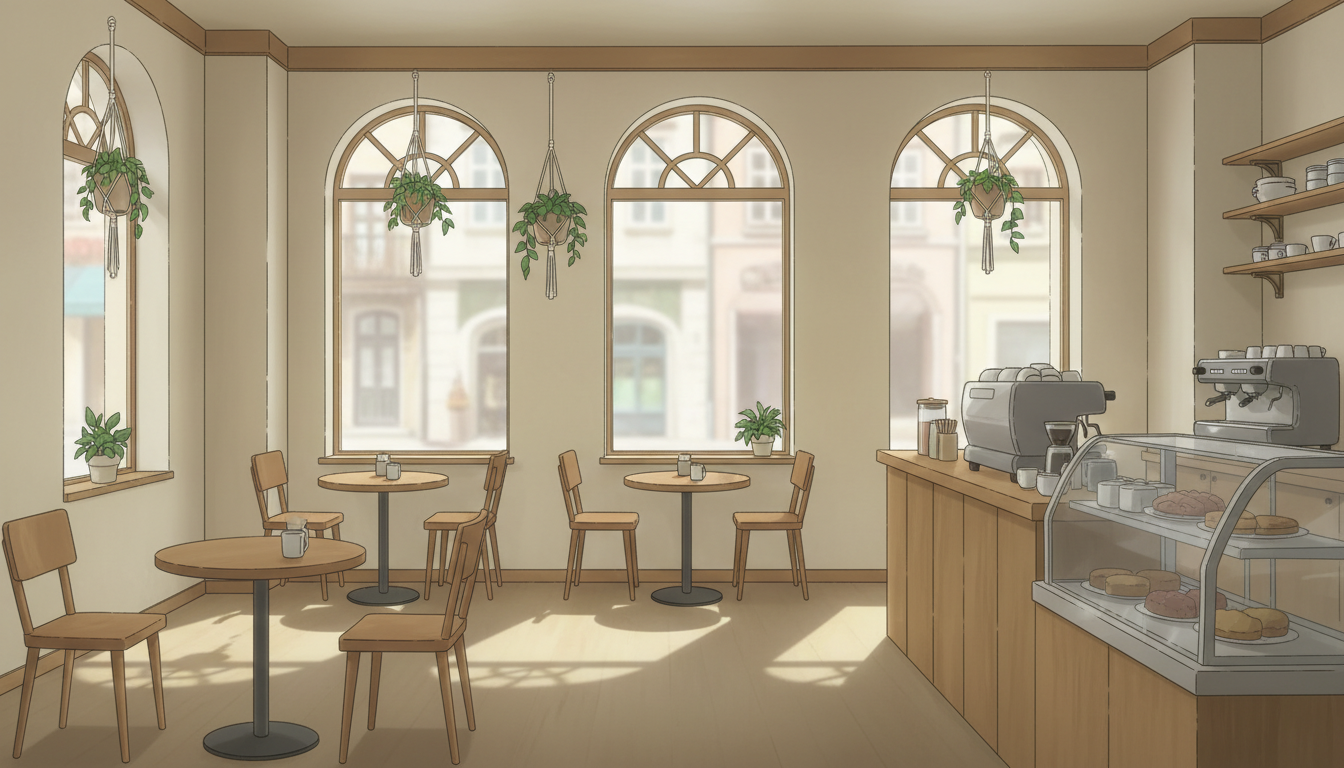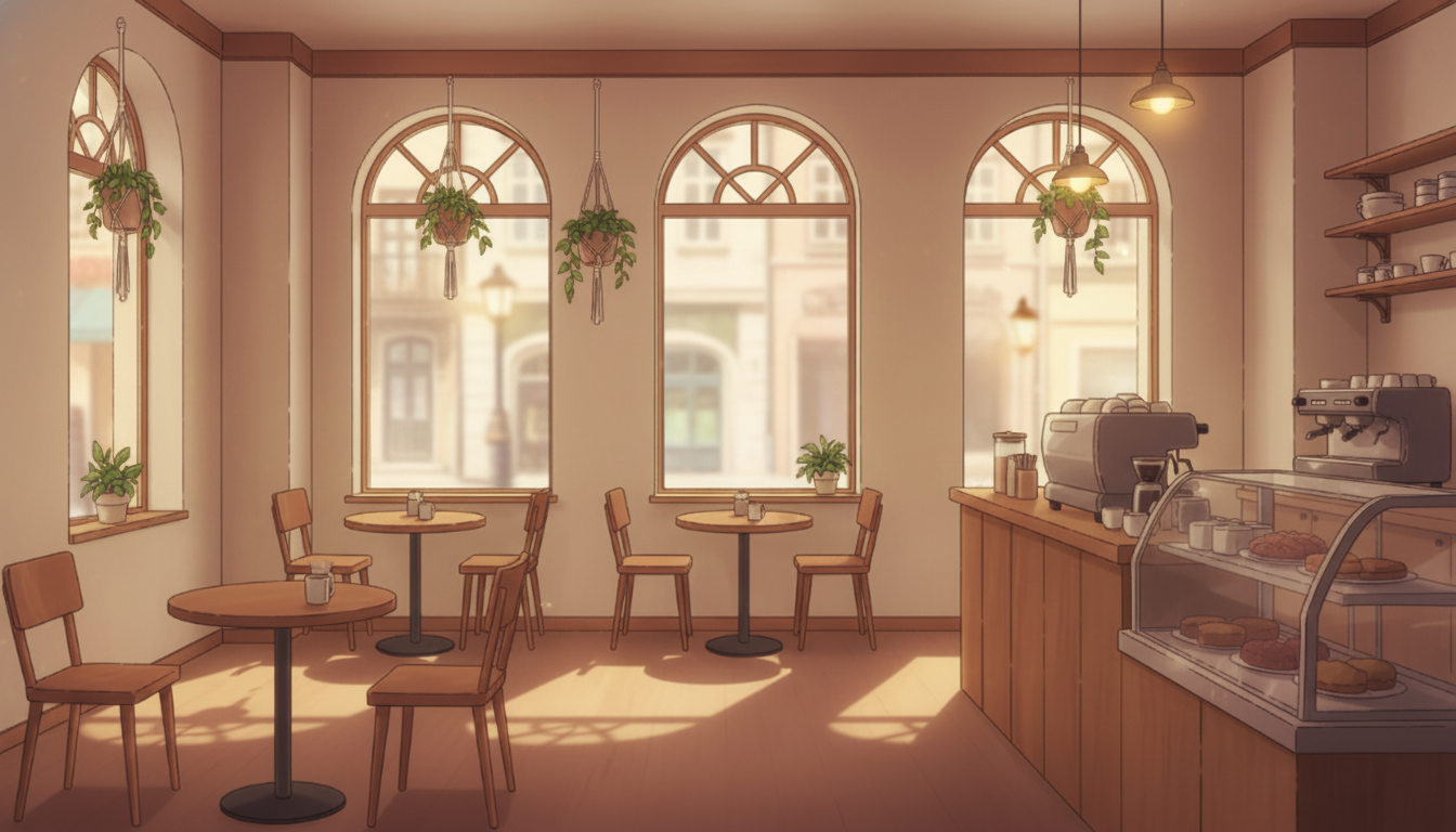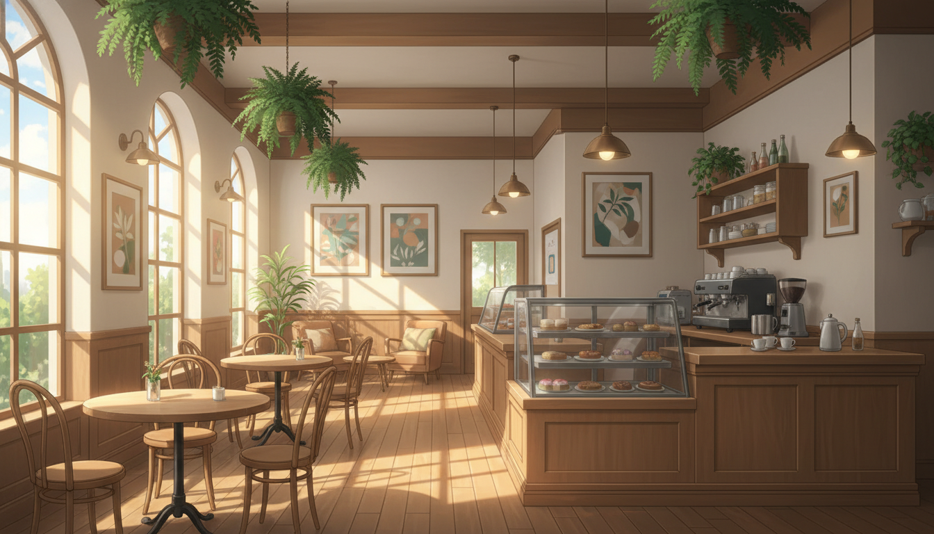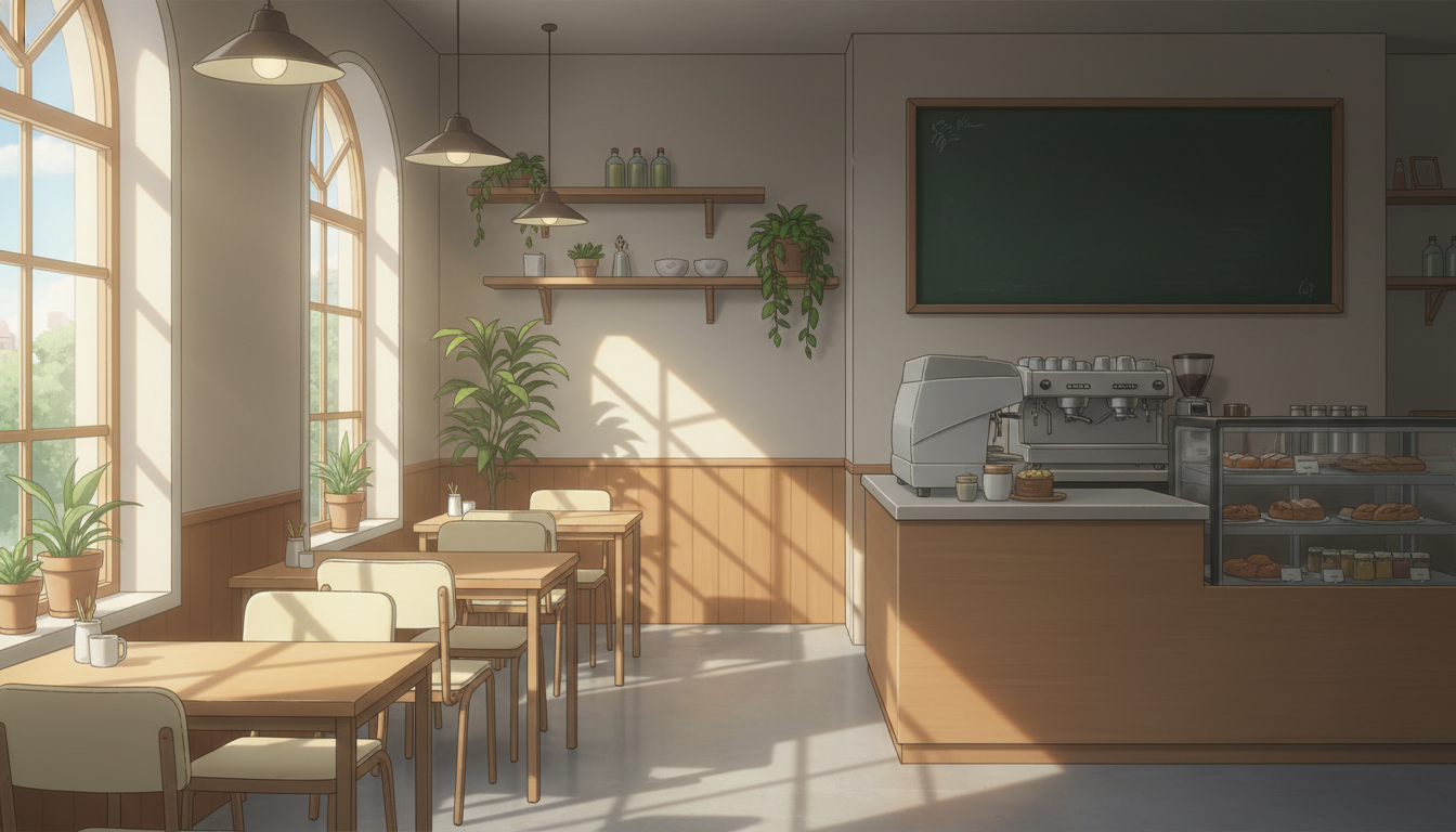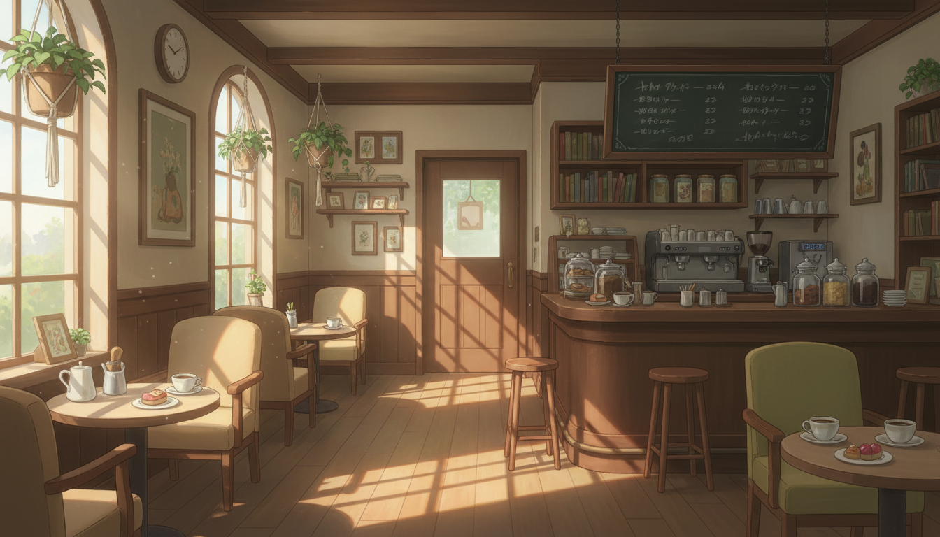 自然光と木の温もりが調和し、日常シーンに使いやすい喫茶店の背景です。