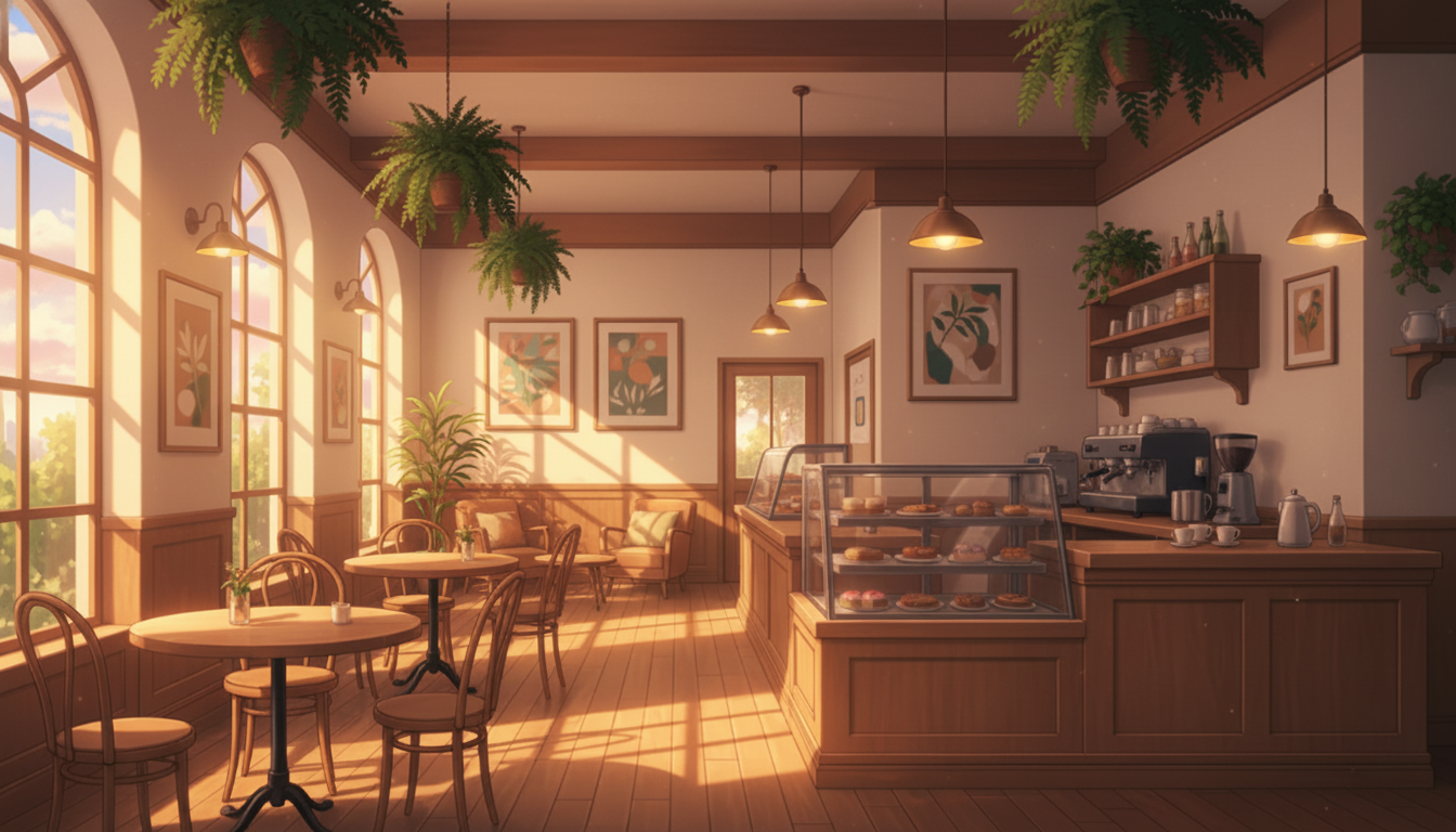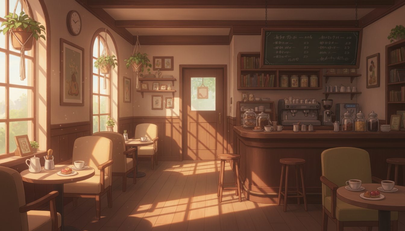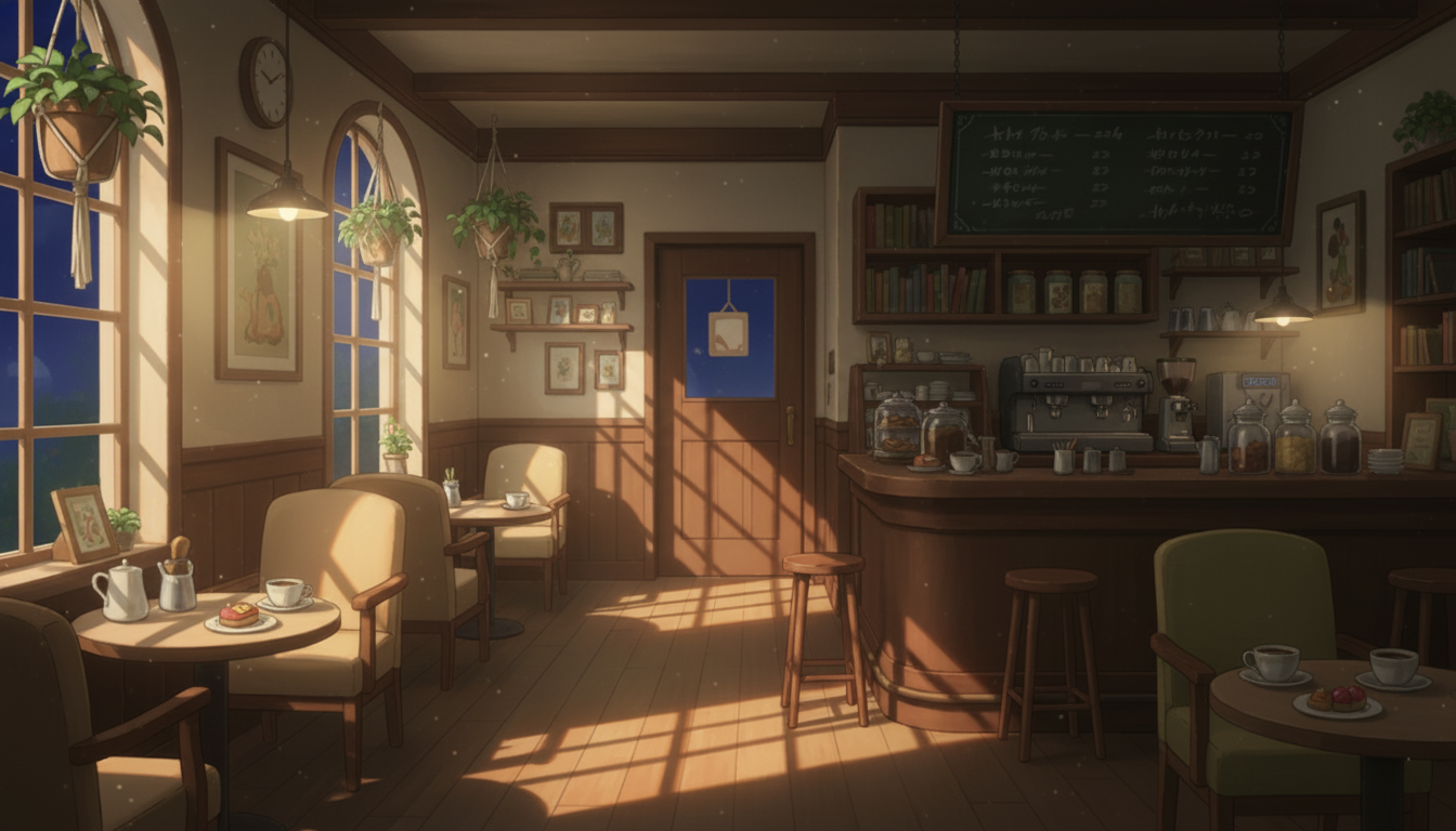 夕方の斜光が店内を包み込み、穏やかなひとときを演出するカフェ背景です。