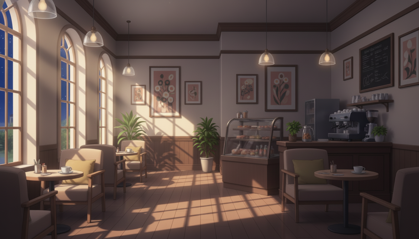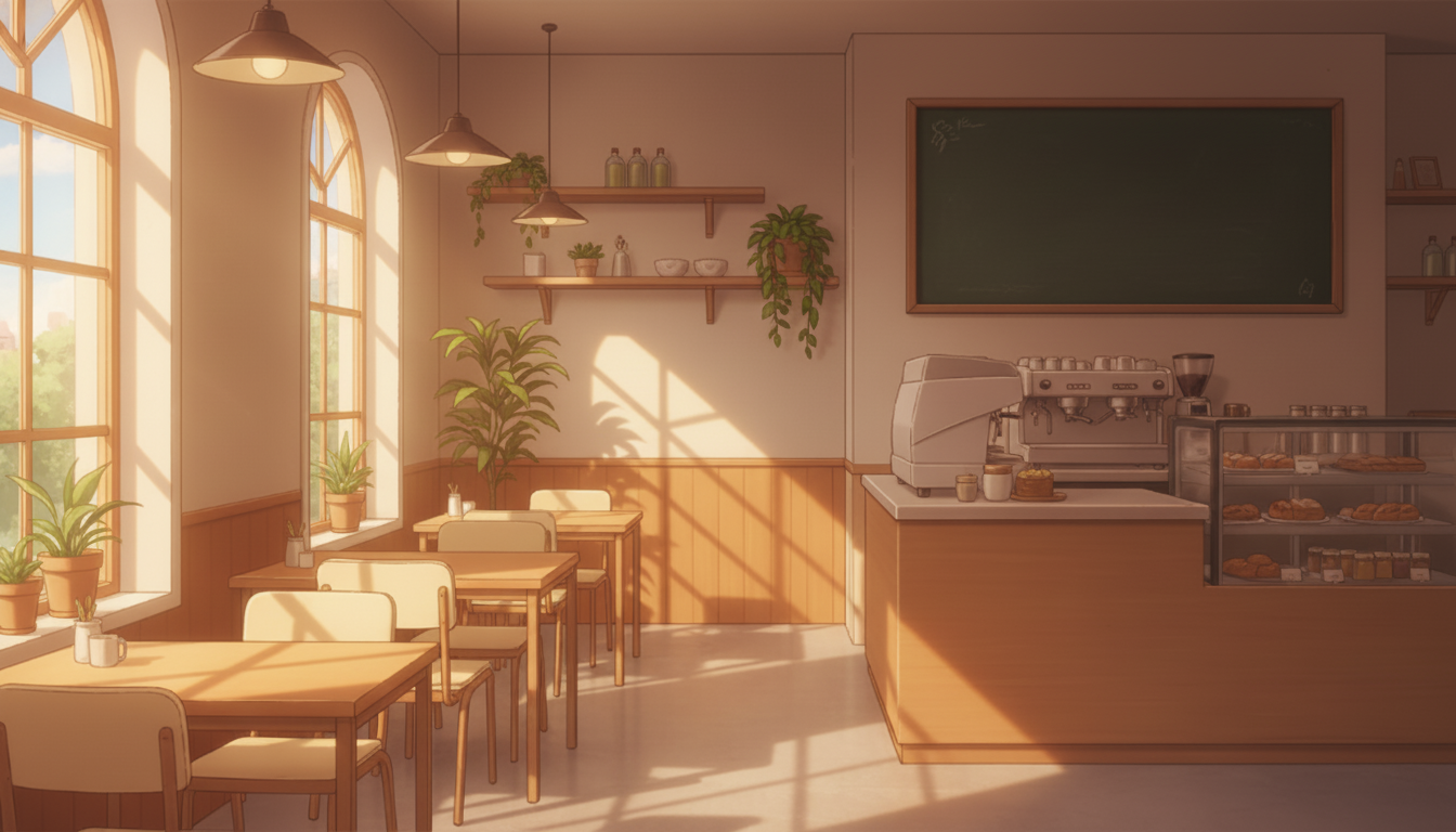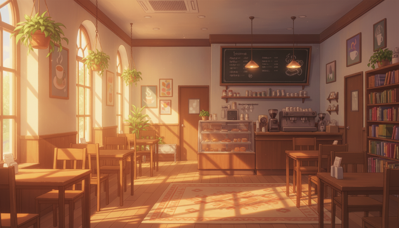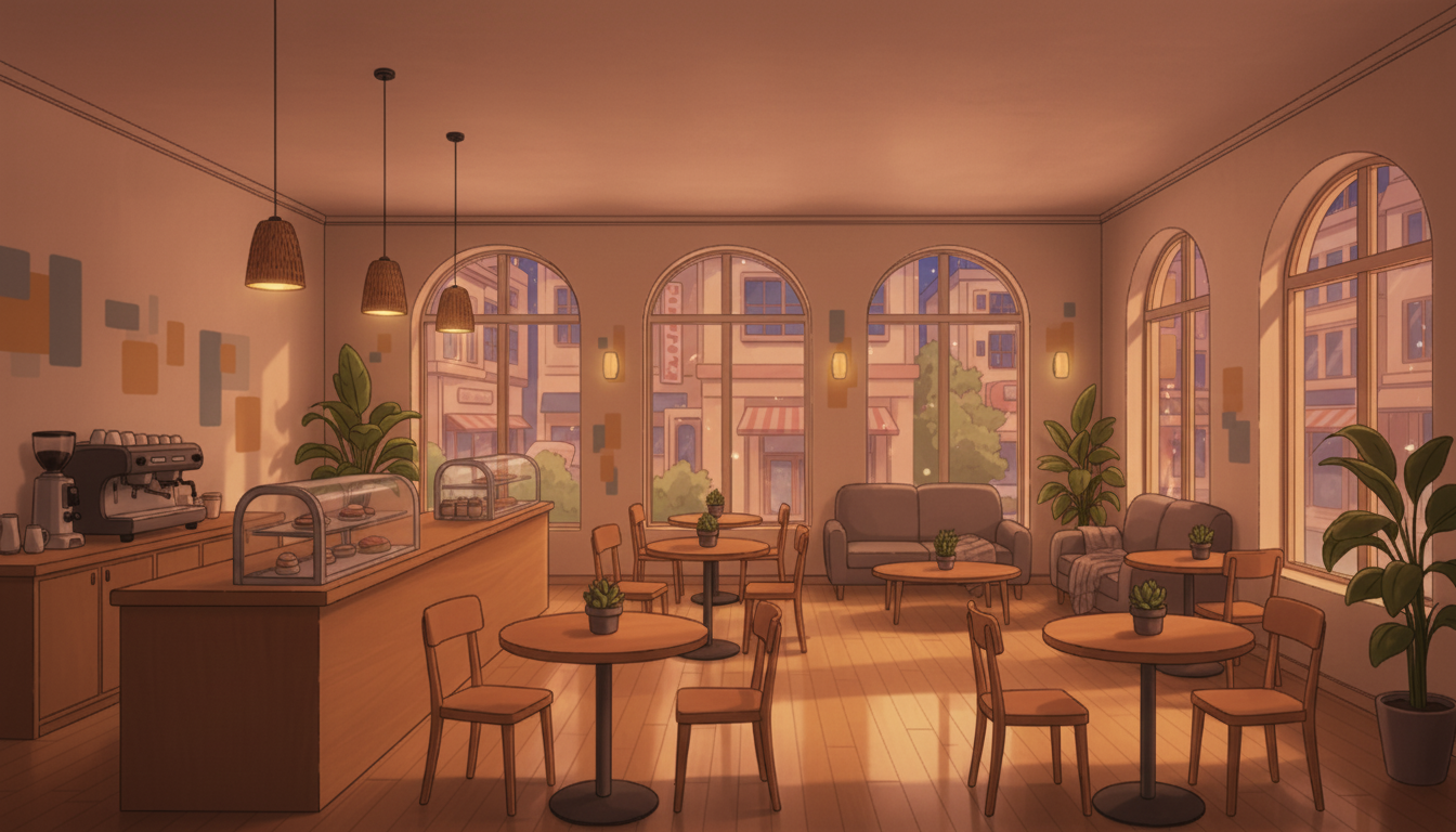 夕方の斜光が店内を包み込み、穏やかなひとときを演出するカフェ背景です。