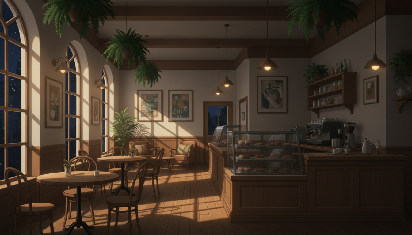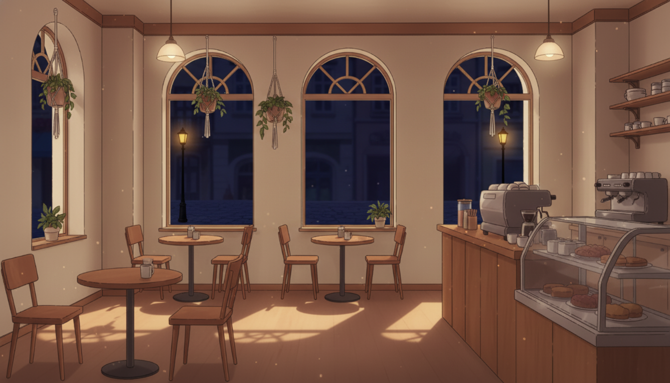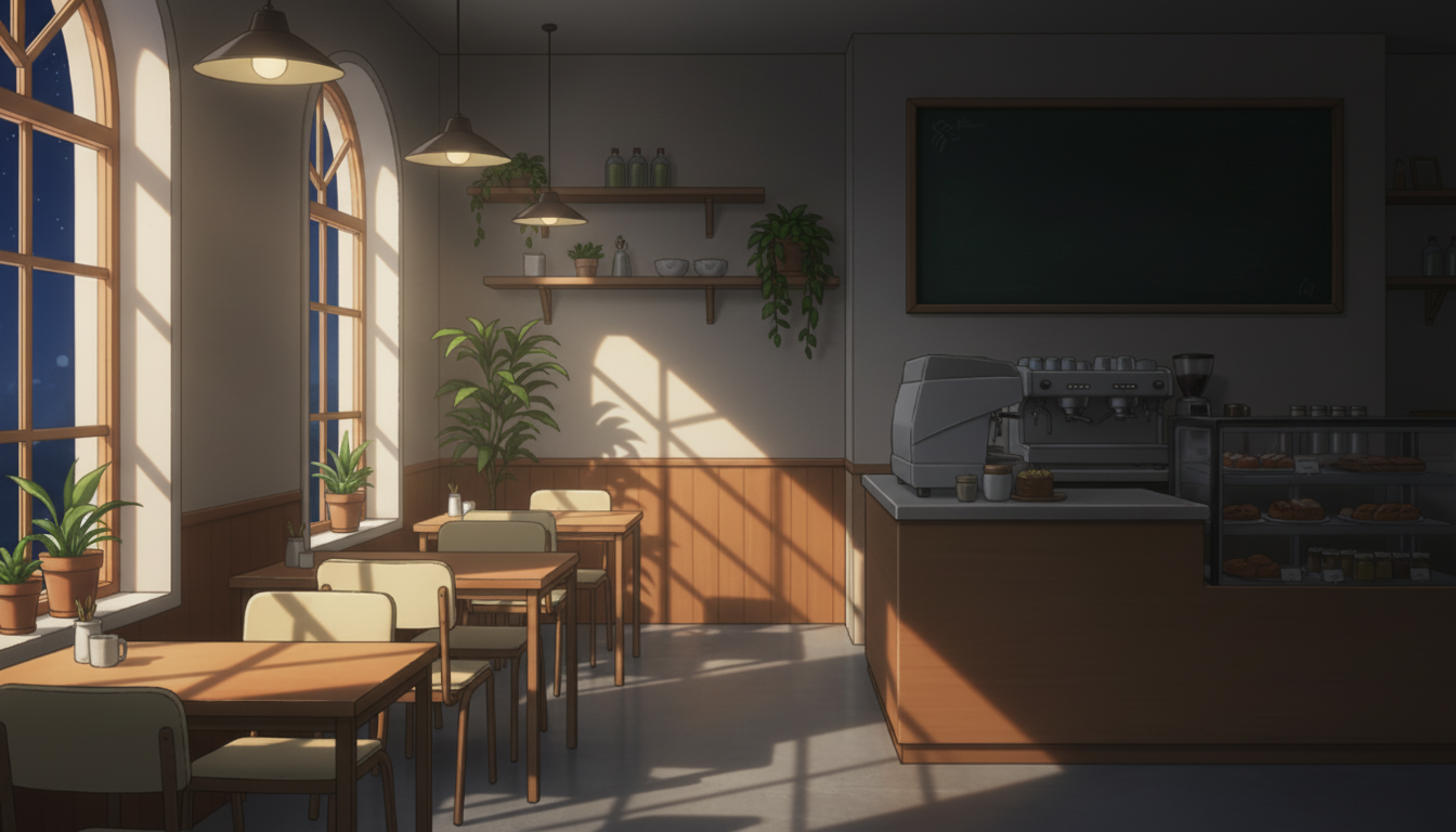 外が夜に変わり、照明の灯りが際立つ落ち着いた雰囲気のカフェ背景です。