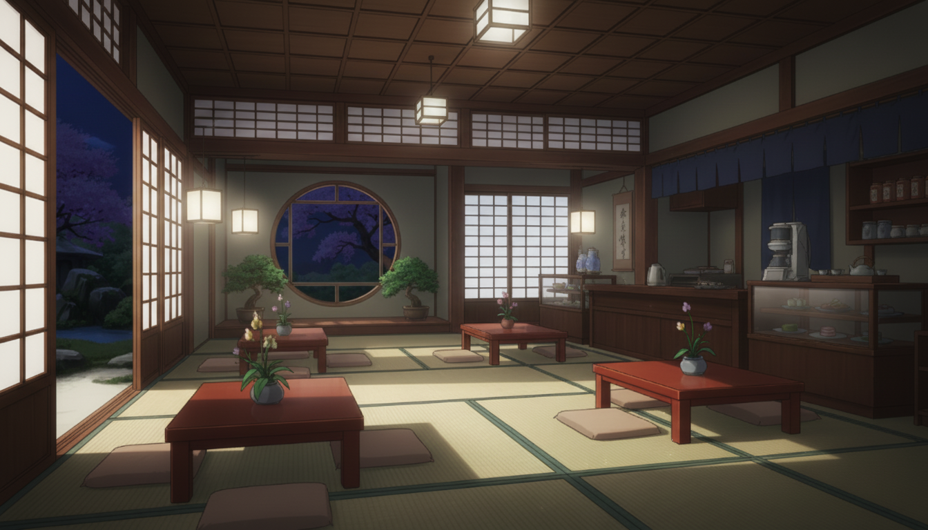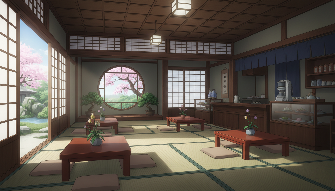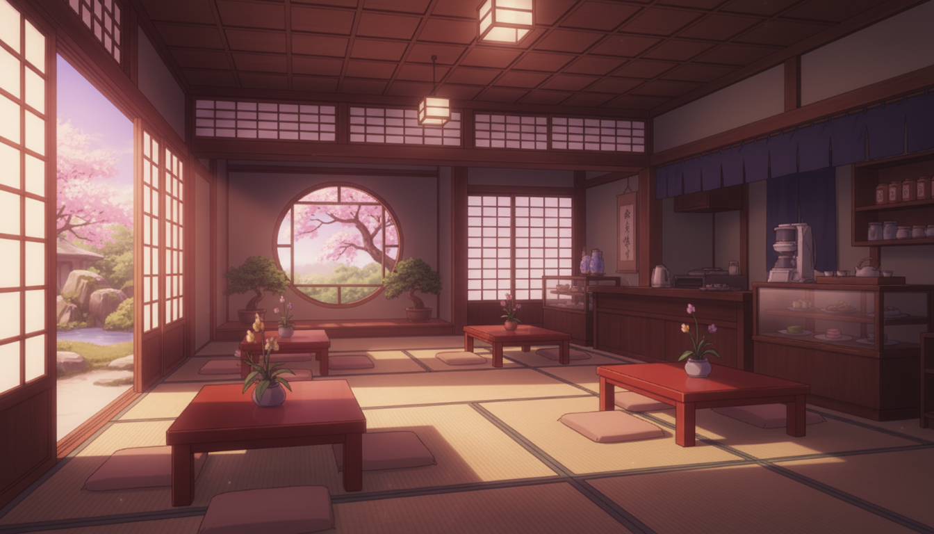 夕暮れの光と桜景色が、情感豊かな和カフェ背景を作り出します。