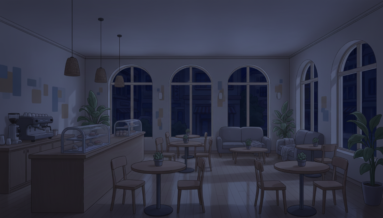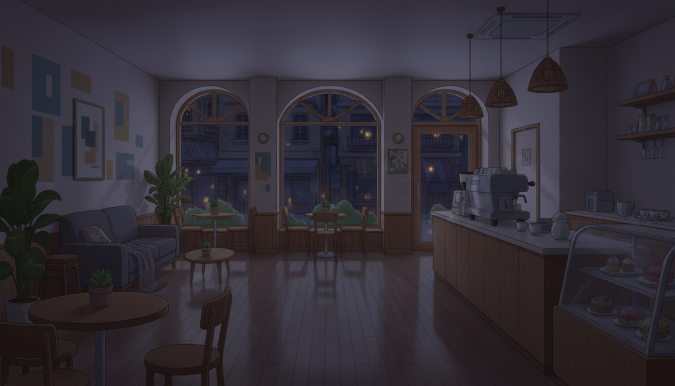 外の灯りと落ち着いた室内が溶け合い、深夜の余韻を感じさせる背景です。