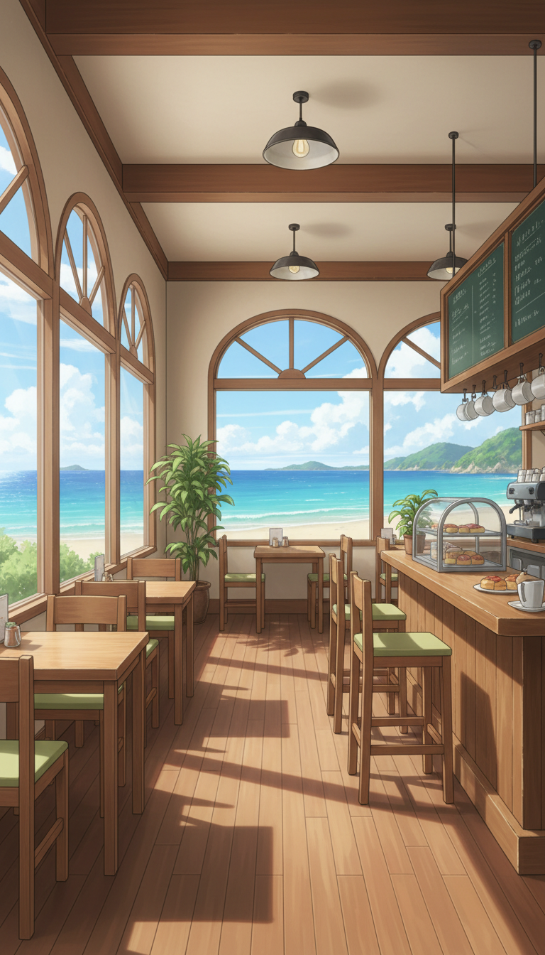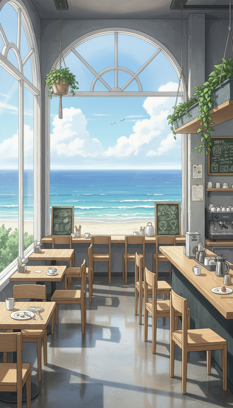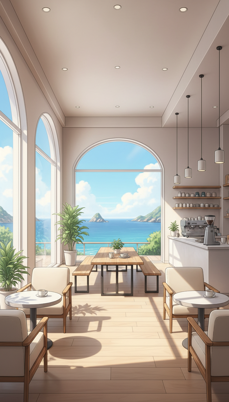 大きな窓から海が見える、心地よい風が吹き抜ける爽やかなカフェの室内シーン。