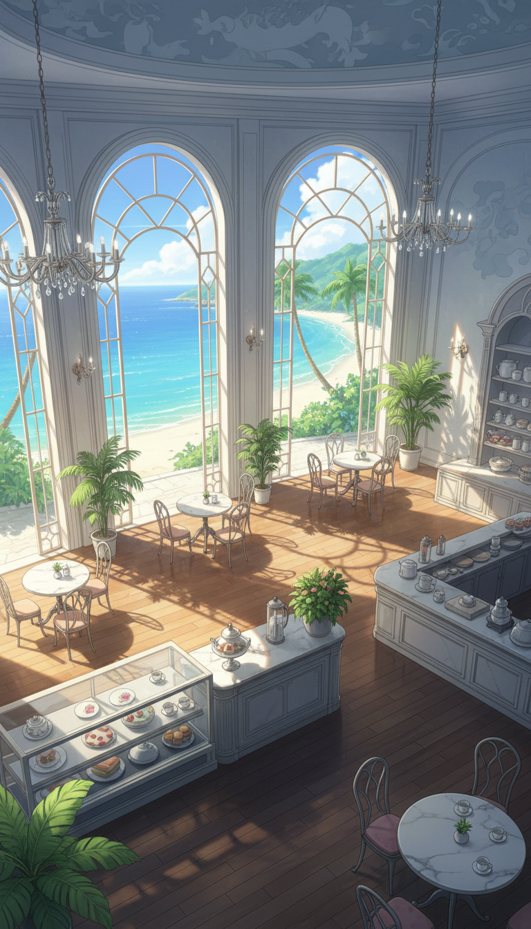 シャンデリアが輝く上品なカフェで、海を望むエレガントな空間を再現。