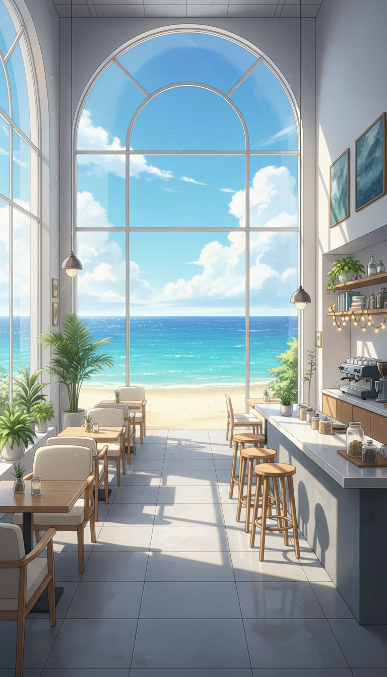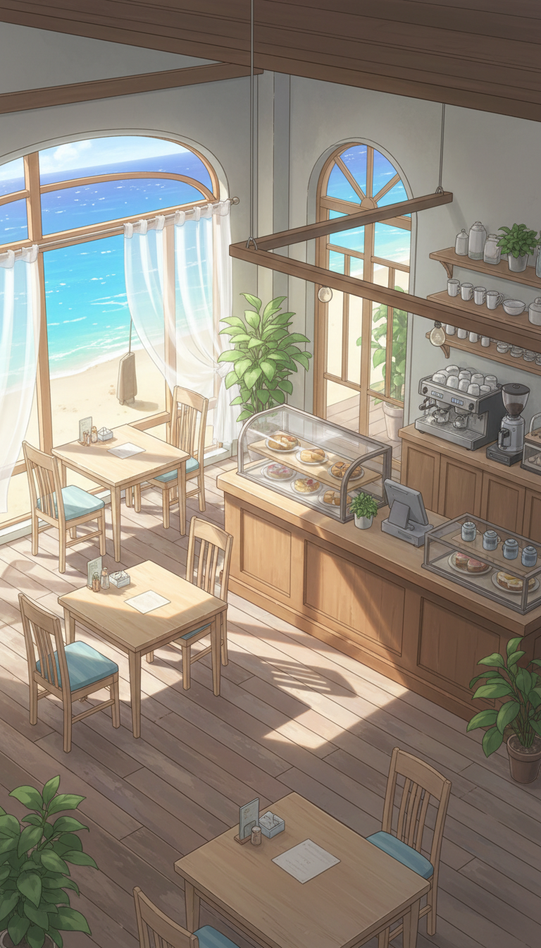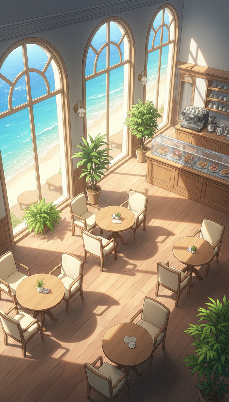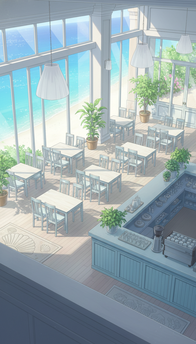 ビーチに面した開放的な空間で、リゾート気分を演出するアニメ背景。