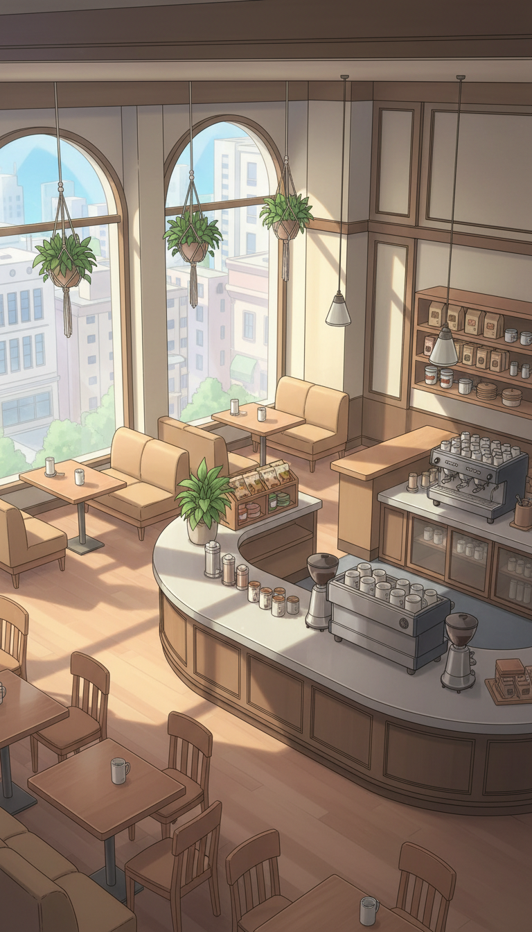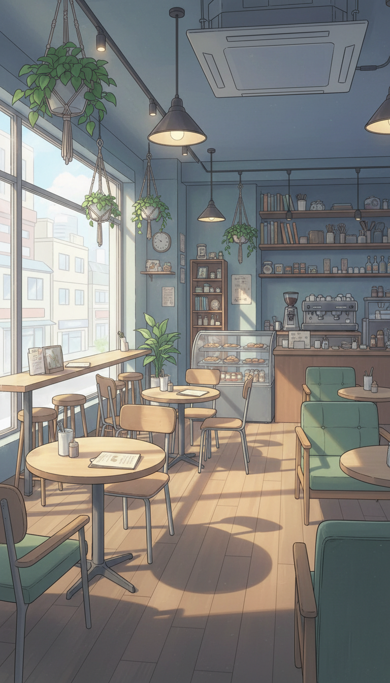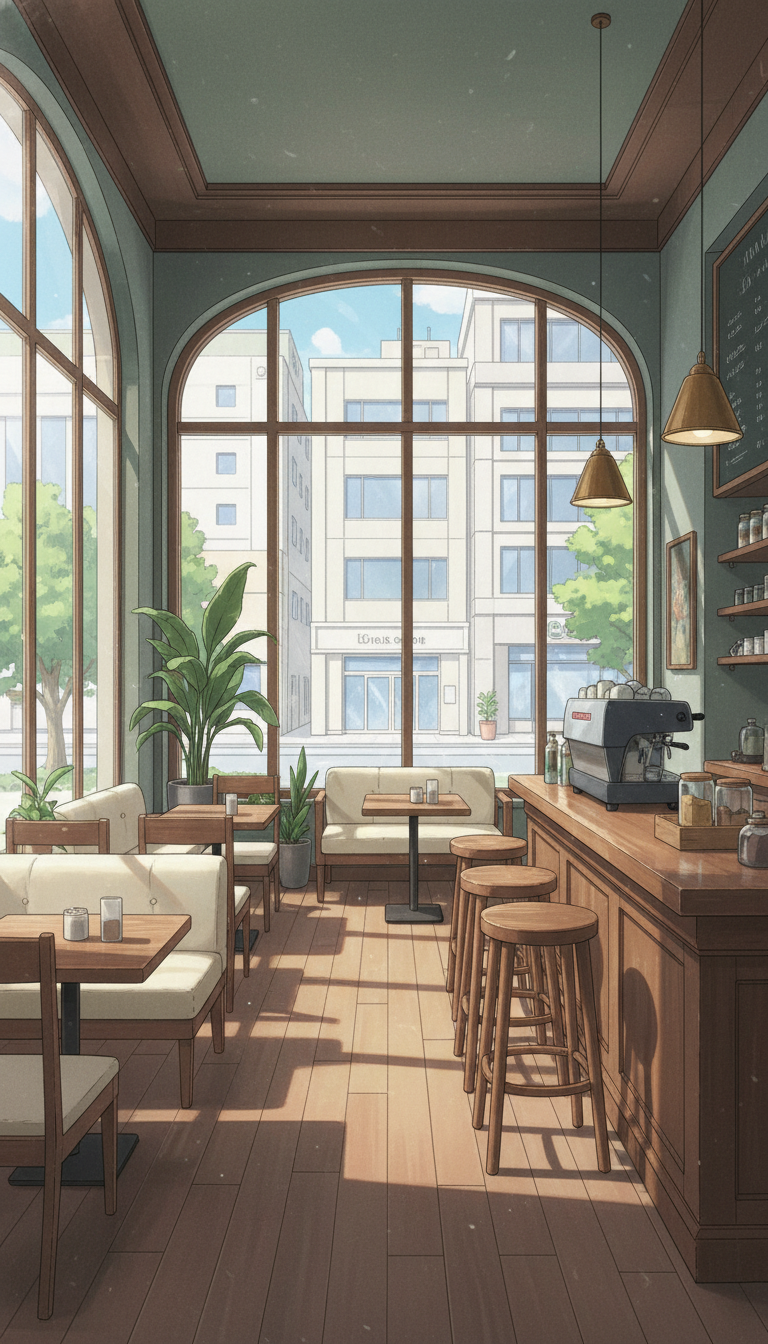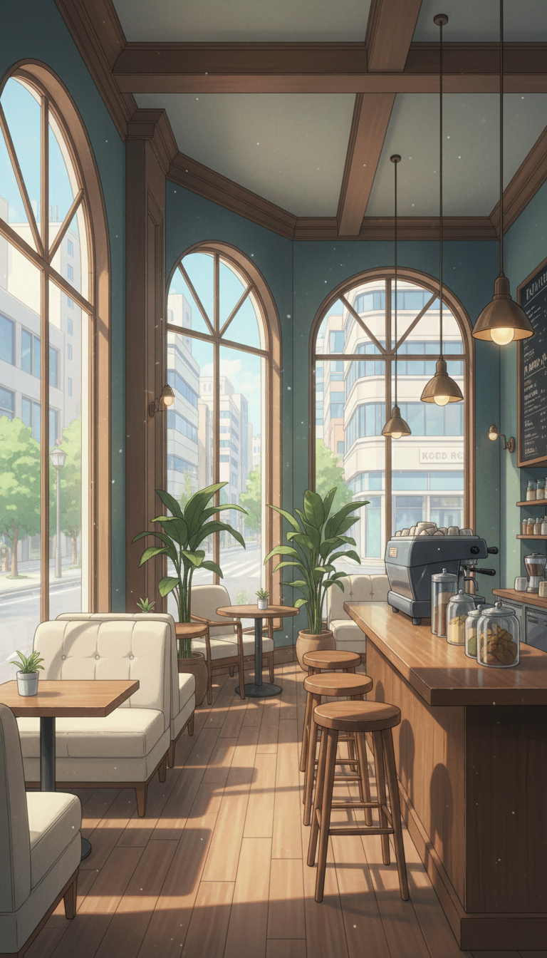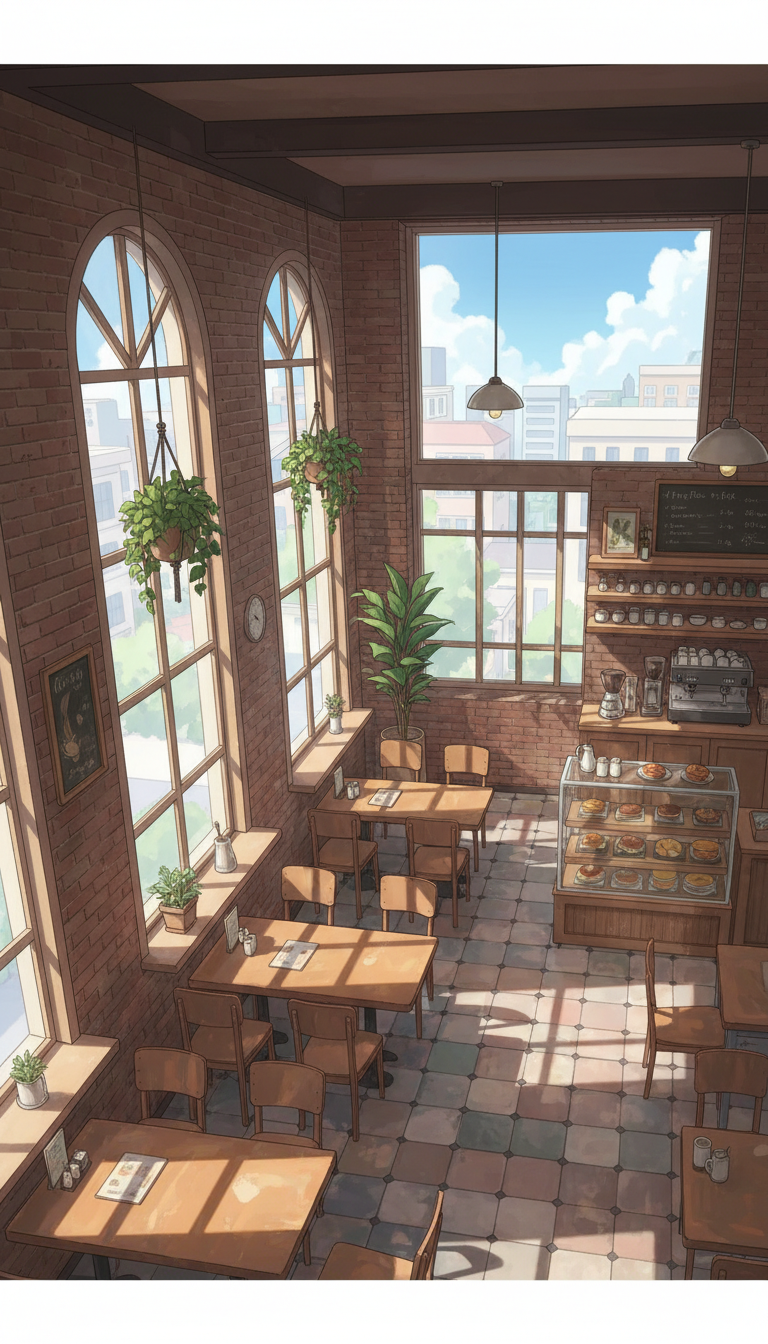 カフェ室内の背景イラスト素材を無料配布。9:16の縦長構図でスマホ作品に使いやすい背景イラストです。漫画・Webtoonやゲーム背景として商用・トレース利用もOK!