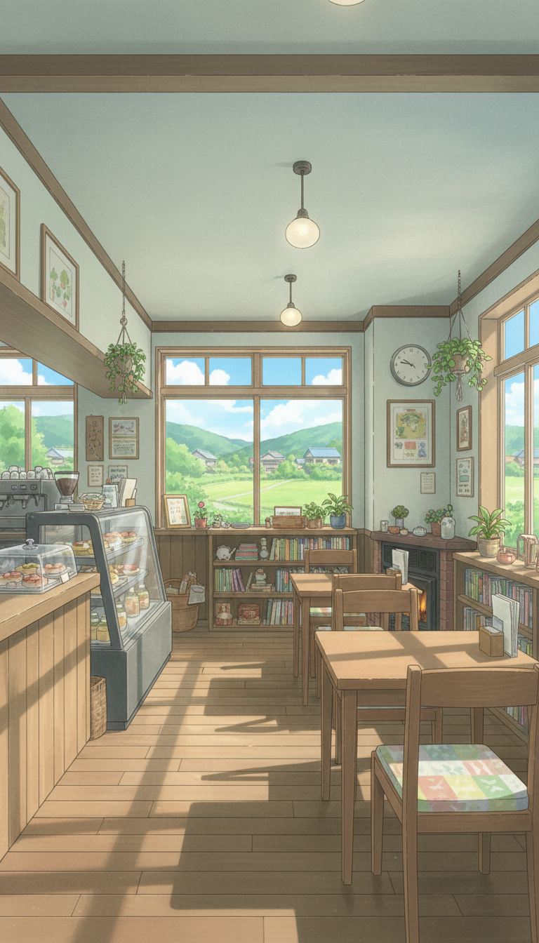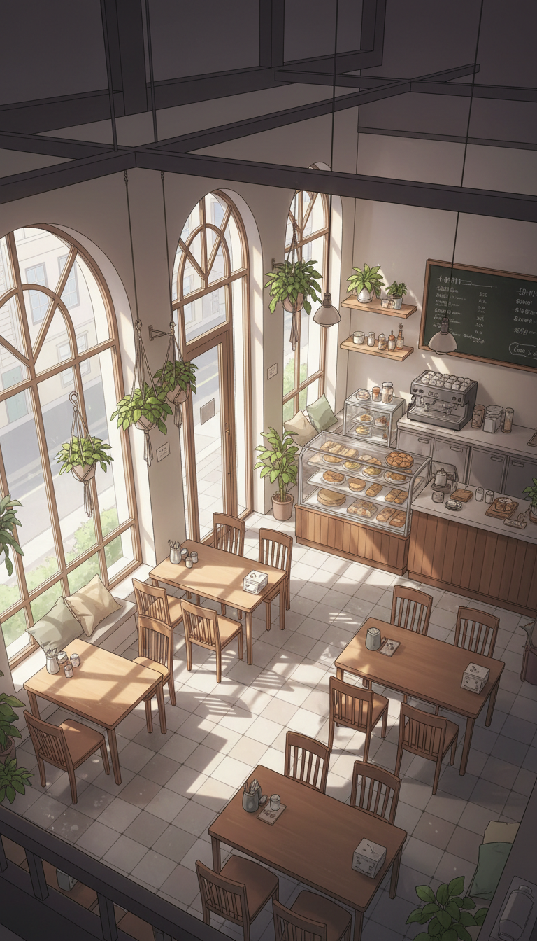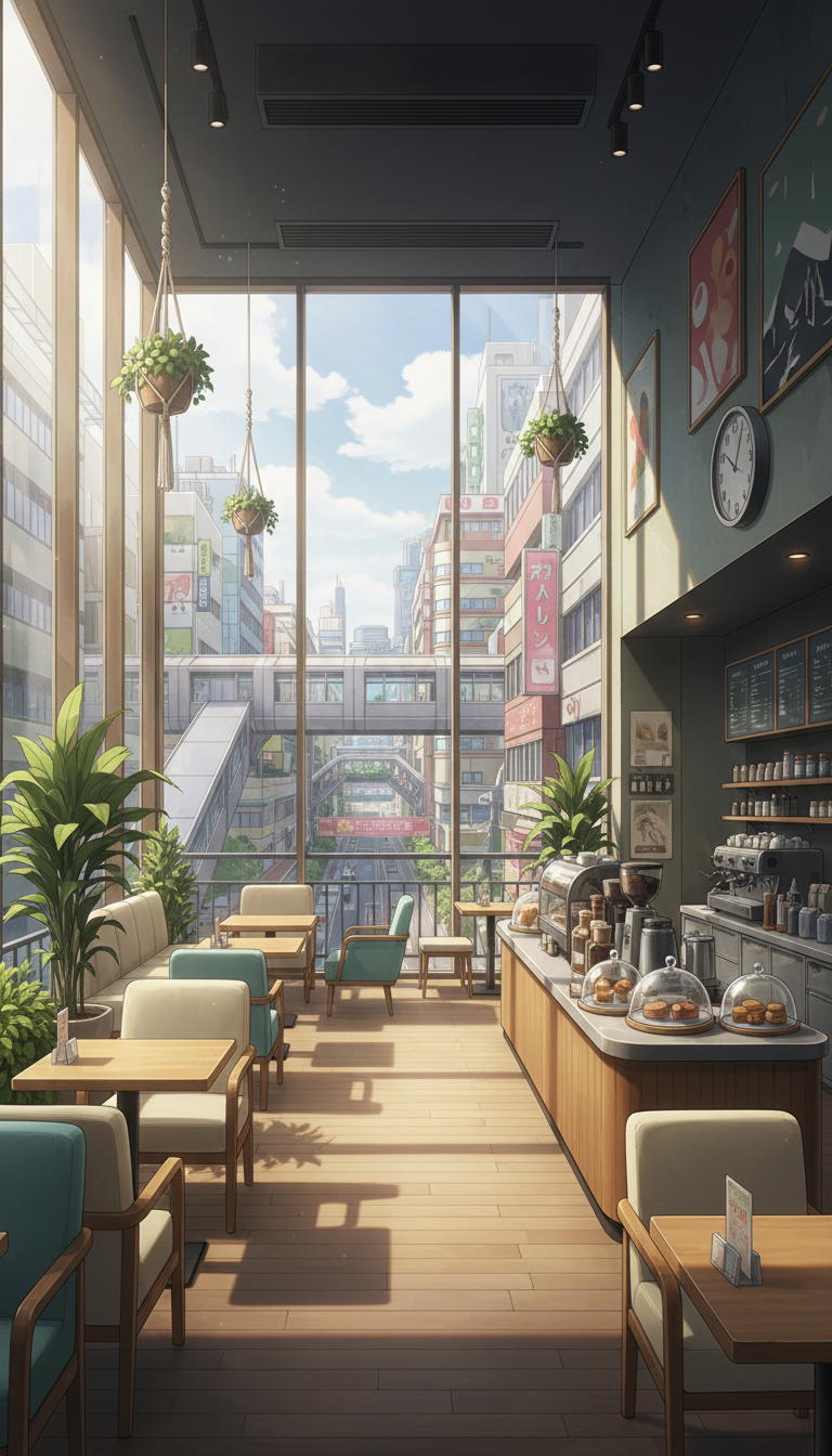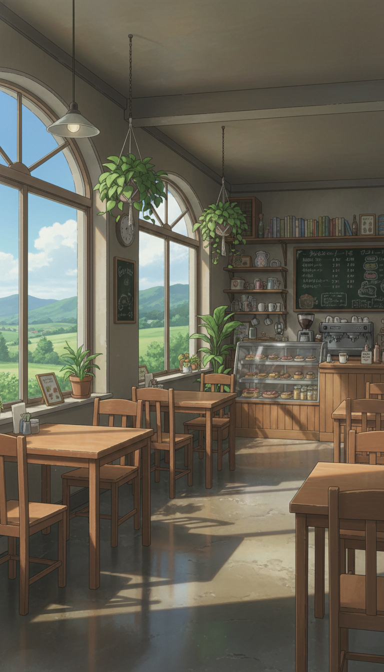 カフェ室内の背景イラスト素材を無料配布。9:16の縦長構図でスマホ作品に使いやすい背景イラストです。漫画・Webtoonやゲーム背景として商用・トレース利用もOK!