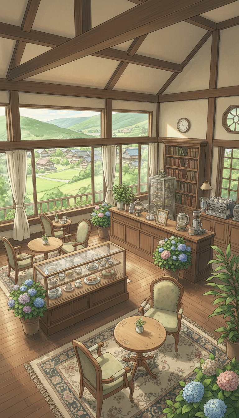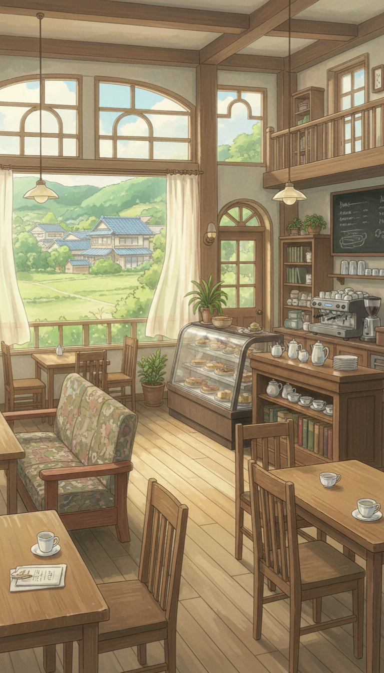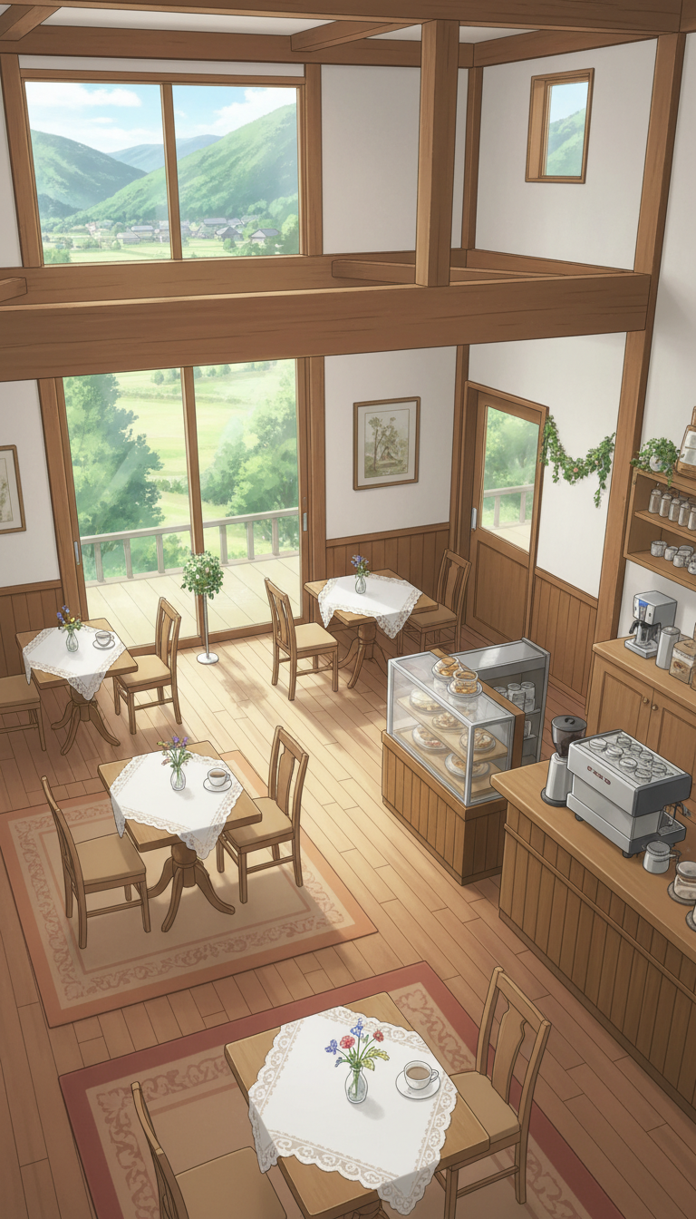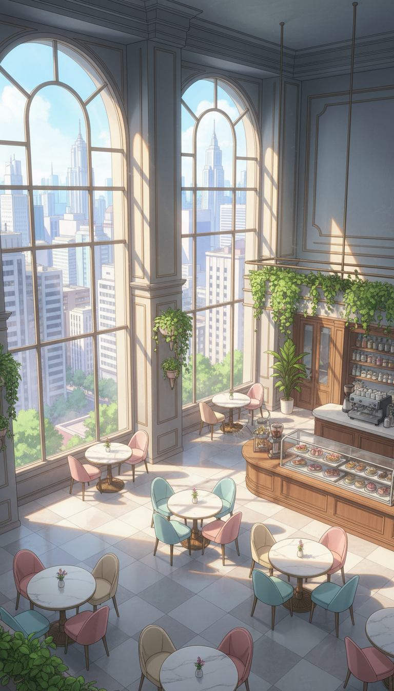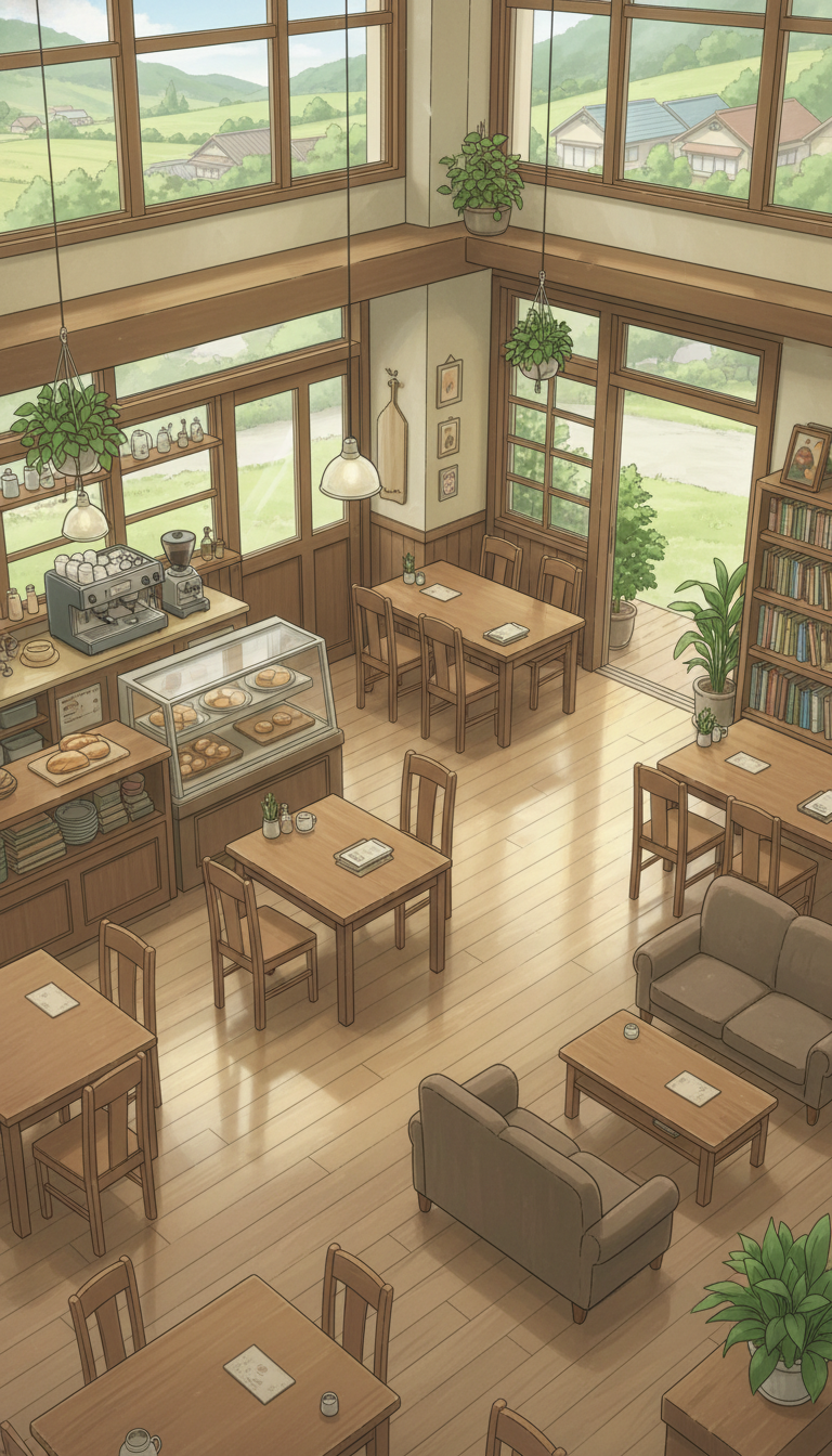 カフェ室内の背景イラスト素材を無料配布。9:16の縦長構図でスマホ作品に使いやすい背景イラストです。漫画・Webtoonやゲーム背景として商用・トレース利用もOK!