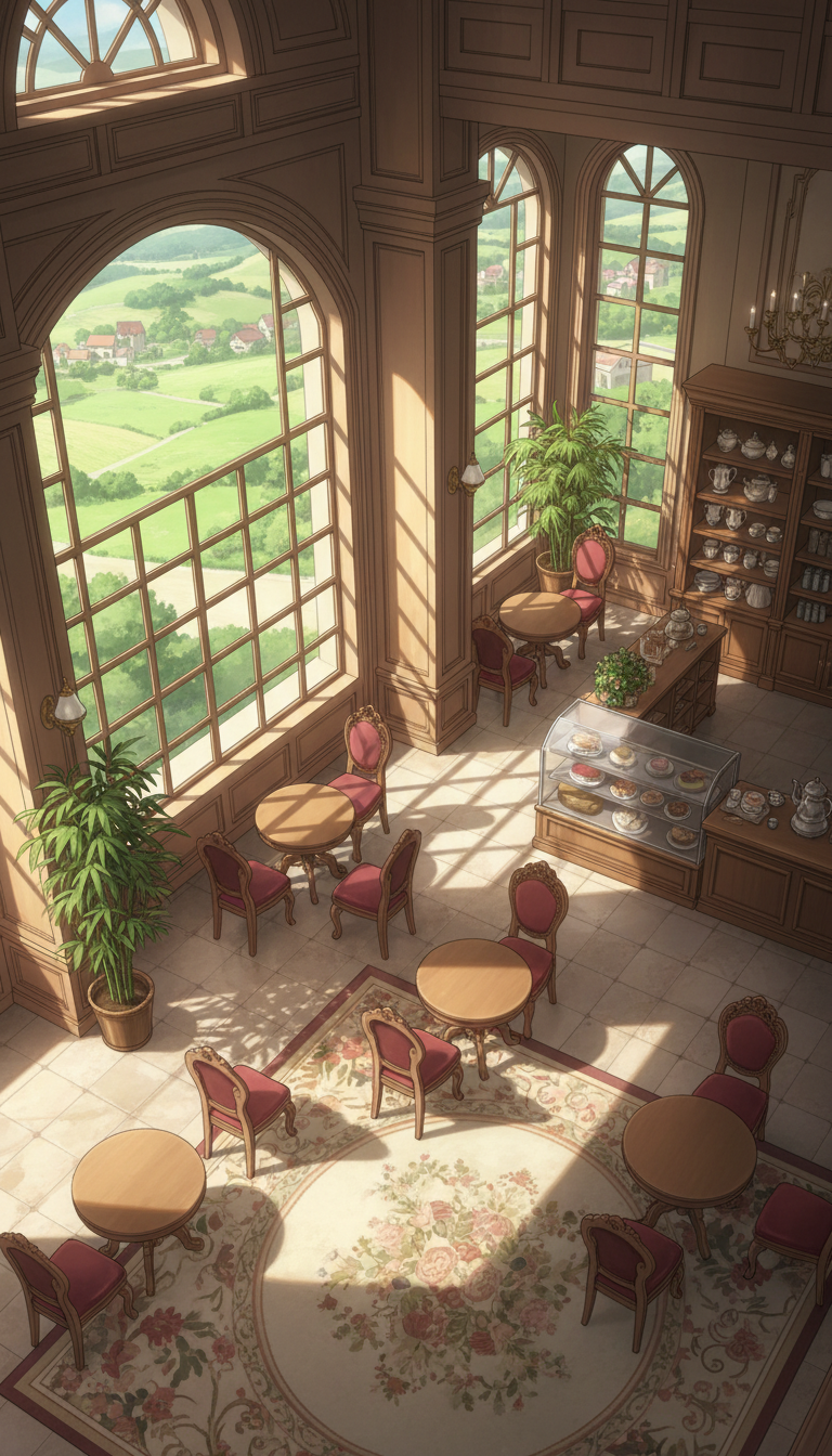 柔らかな光が注ぐ開放的な空間で、日常と非日常が交わるアニメ背景。