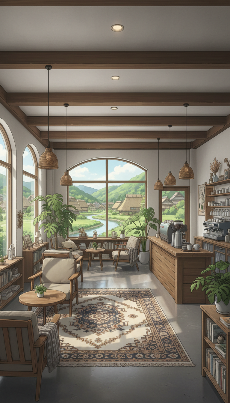 大きな窓と木の梁が印象的な、スタイリッシュなカフェの室内シーン。