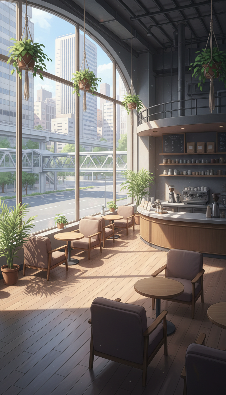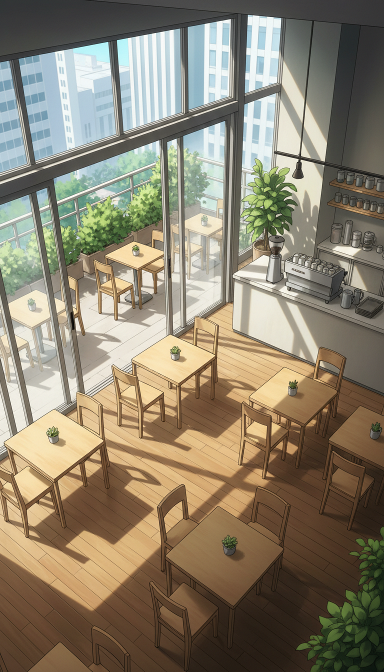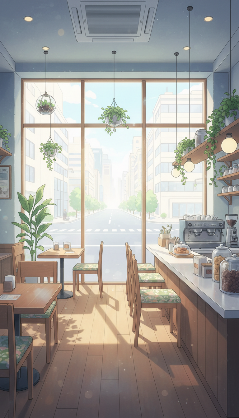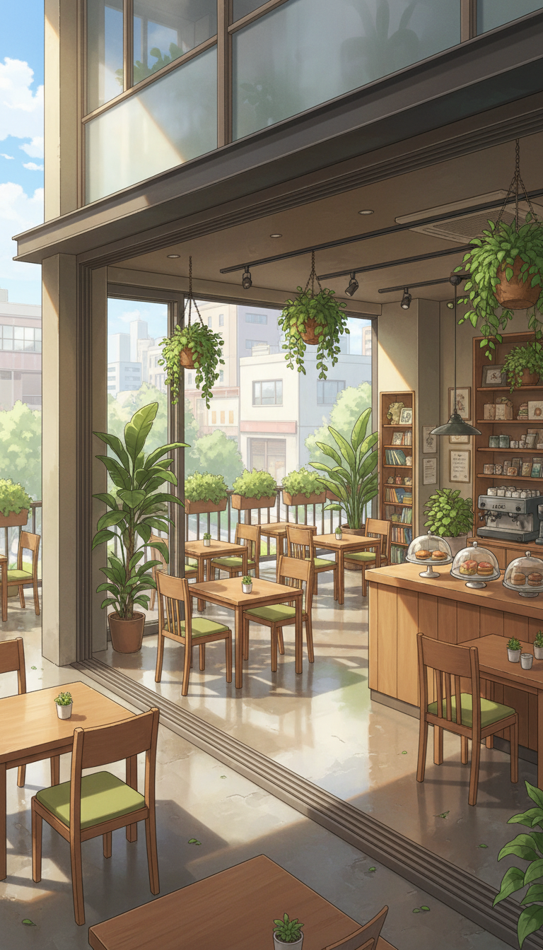 柔らかな日差しと観葉植物が調和した、落ち着きあるアニメ風カフェ背景。