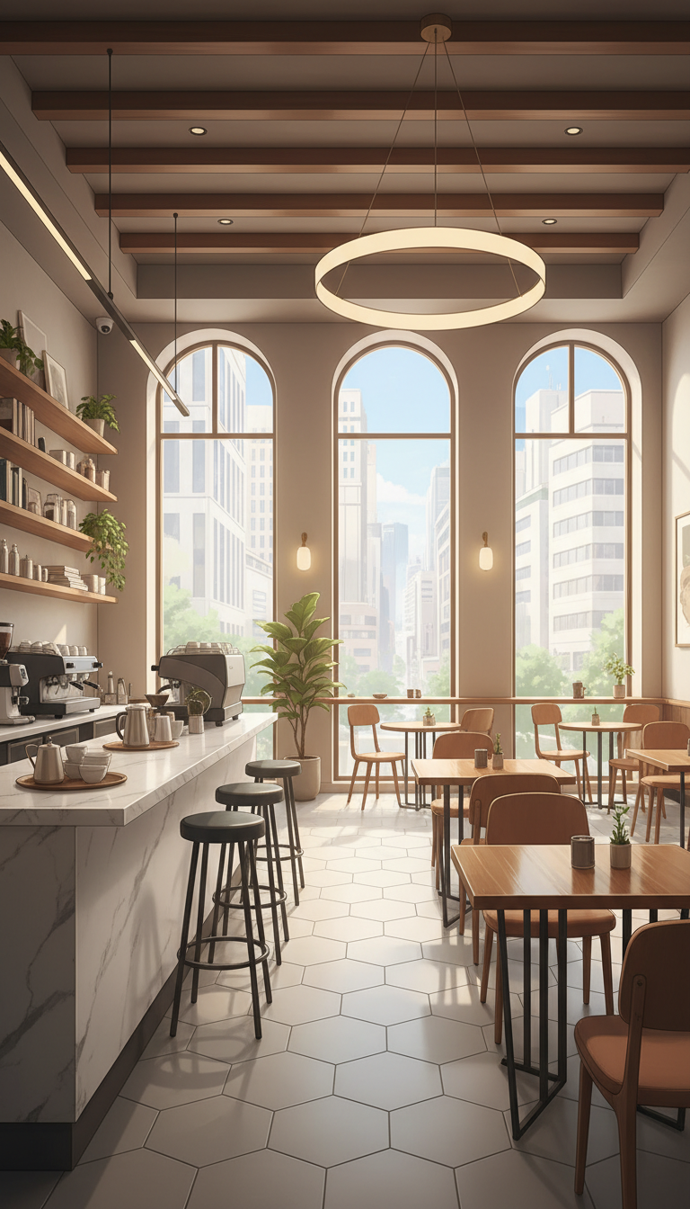 都会の温かい日差しが差し込む、アニメや漫画のワンシーンにぴったりなカフェの内装です。