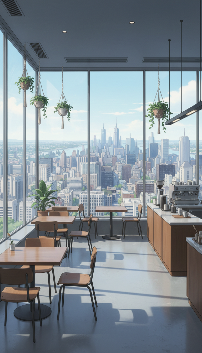 高層ビルの眺望カフェ|窓辺に広がるシティビュー