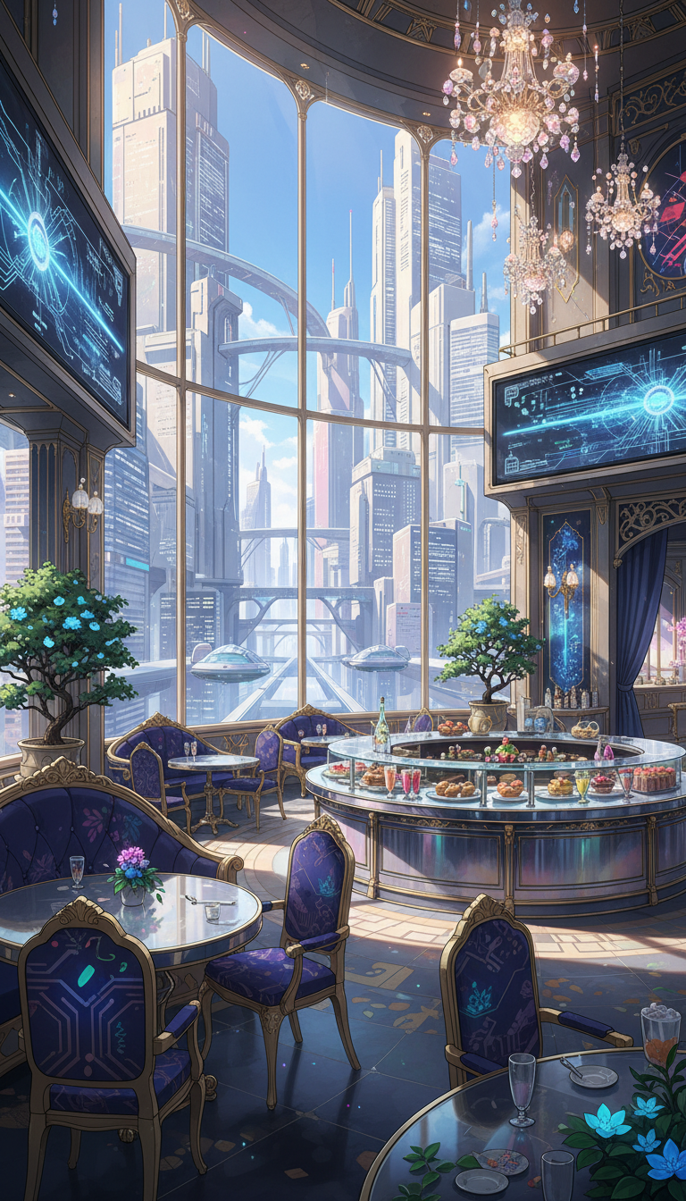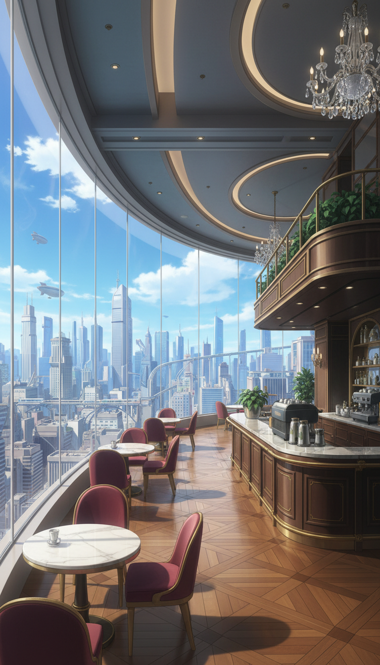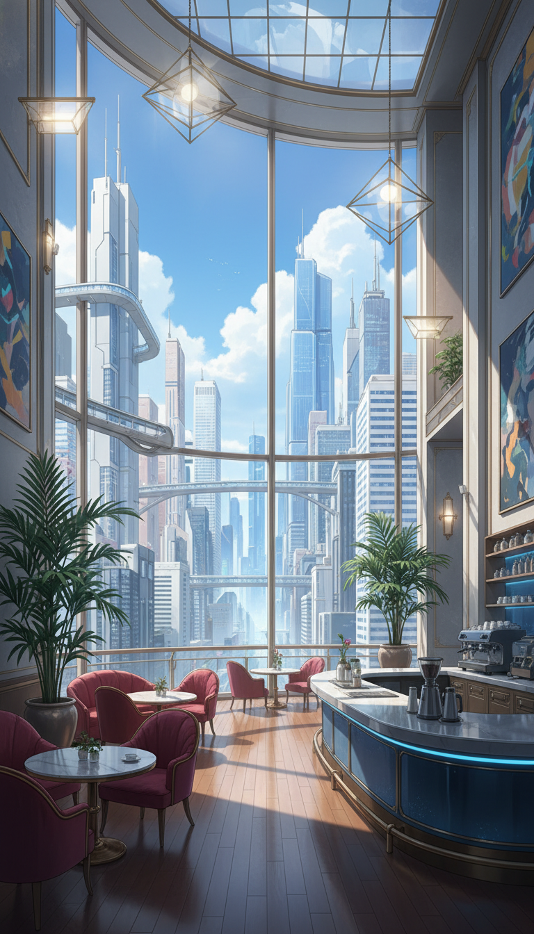 未来都市のカフェラウンジ|SF世界の優雅な喫茶空間