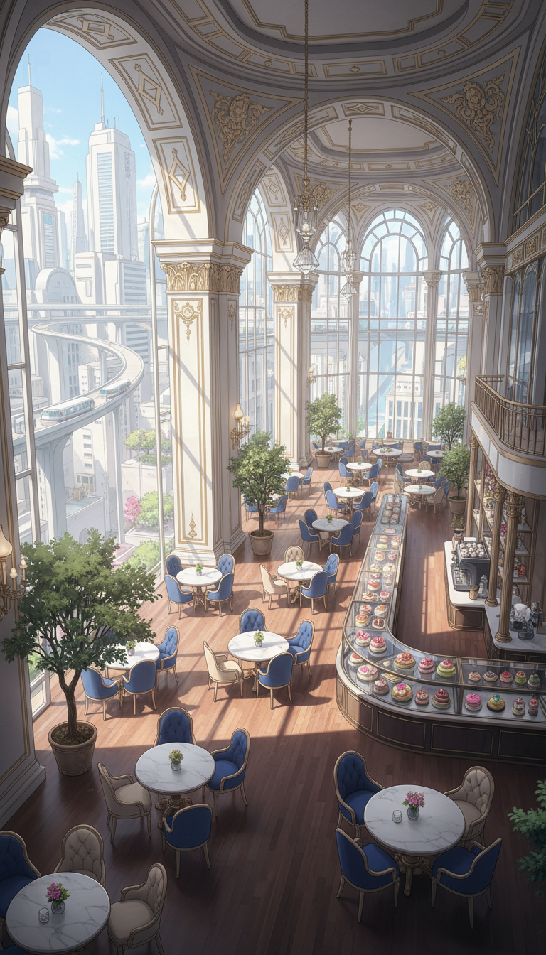 ガラスのアトリウムカフェ|未来都市を望む優雅なティータイム