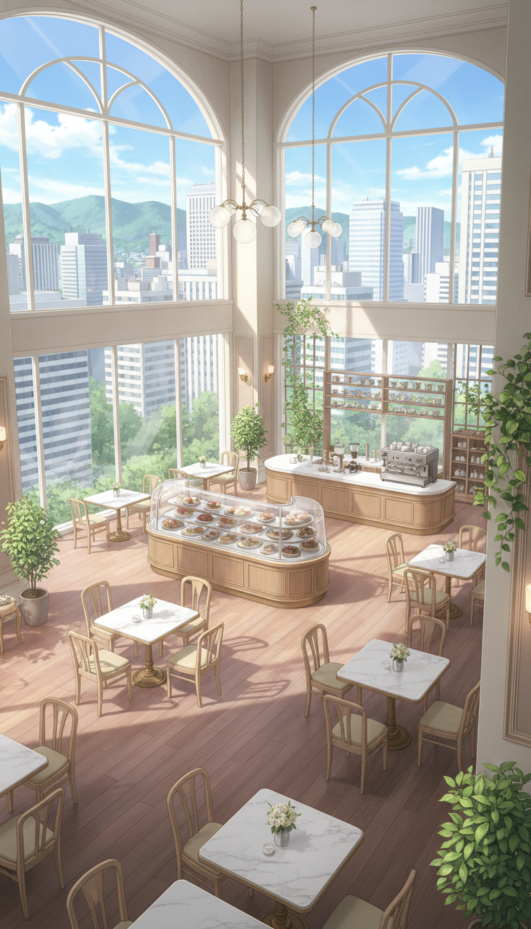 白い光に包まれたスカイカフェ|爽やかな朝のパティスリー風景