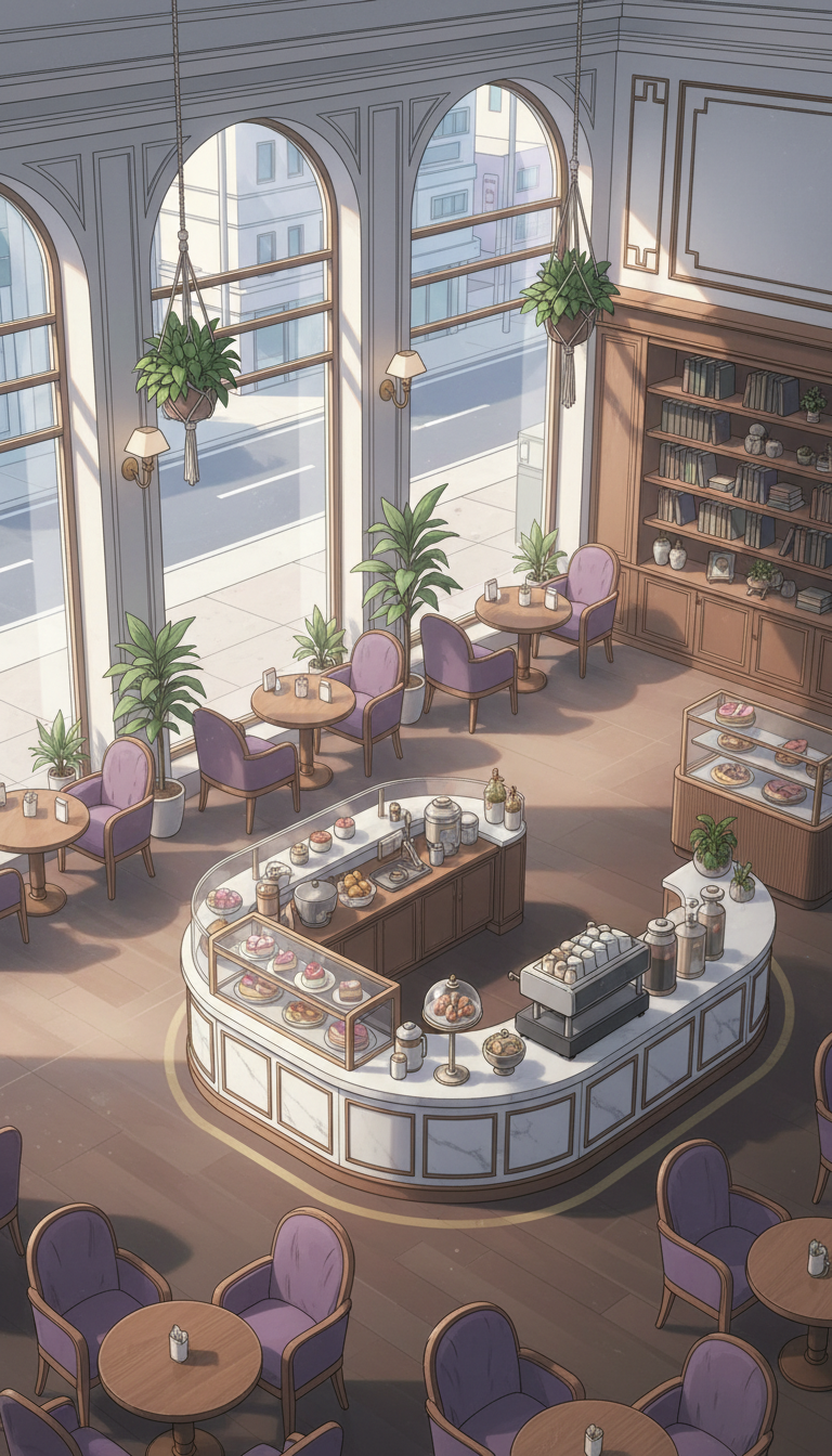 カフェ室内の背景イラスト(縦長/9:16)を無料で配布します。スマホ向け作品に便利な縦長の素材です。俯瞰構図のイラストも多くとても便利です。ウェブトゥーン/ゲーム/漫画、その他広告を含めてご活用ください。商用利用可&無償、トレース、加筆修正可。