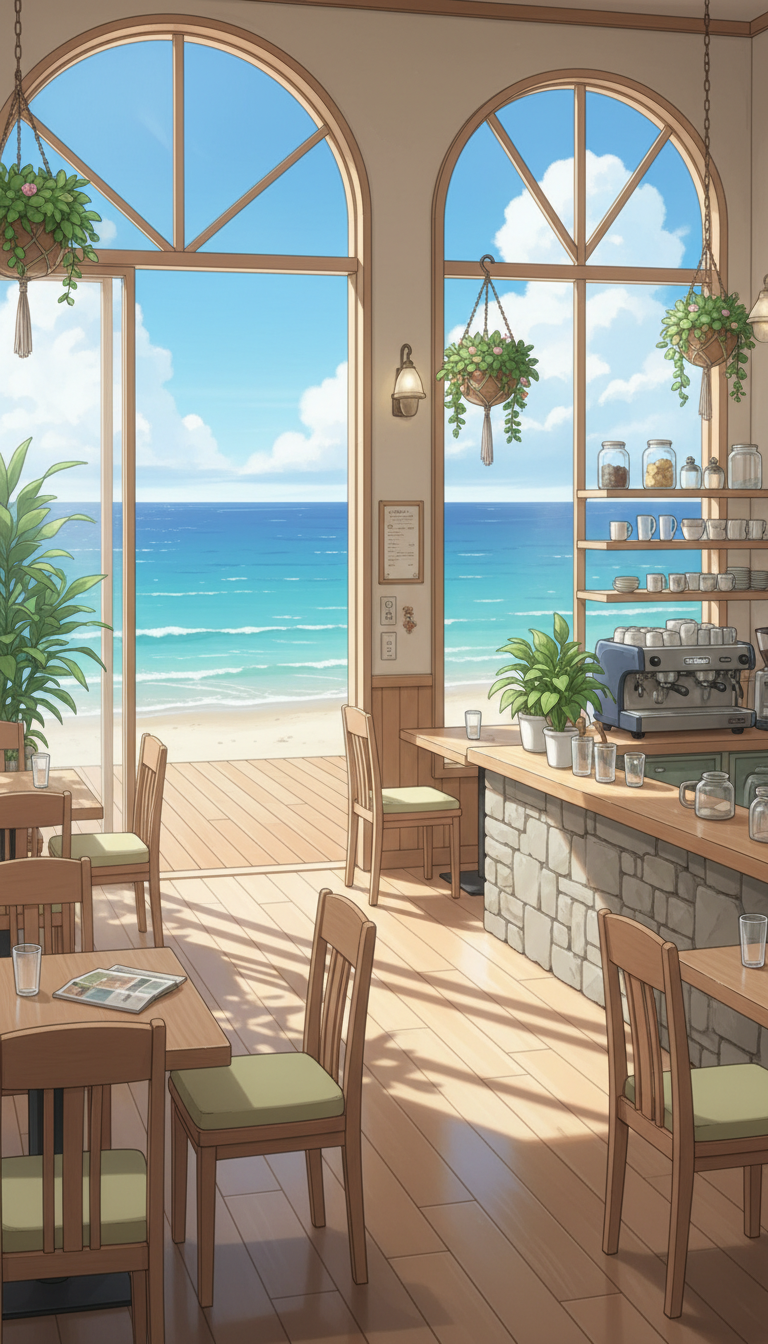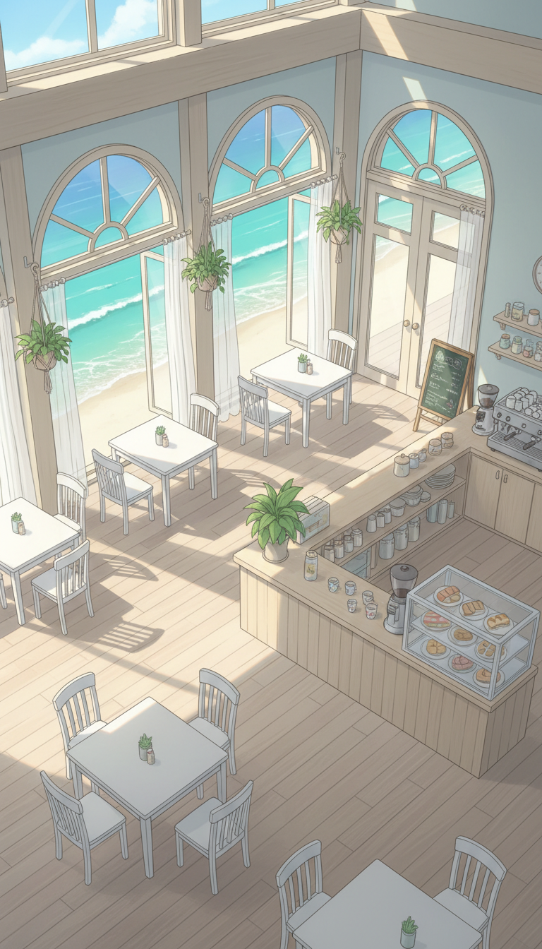 海辺のカフェインテリア|光と潮風を感じる明るい店内背景