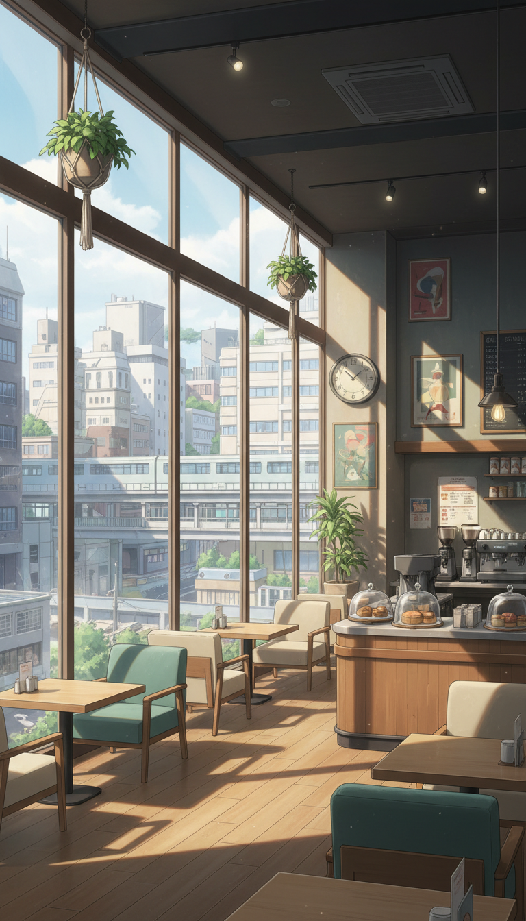 都会の街並みと電車の風景を描いた、穏やかな時間が流れるカフェの背景。