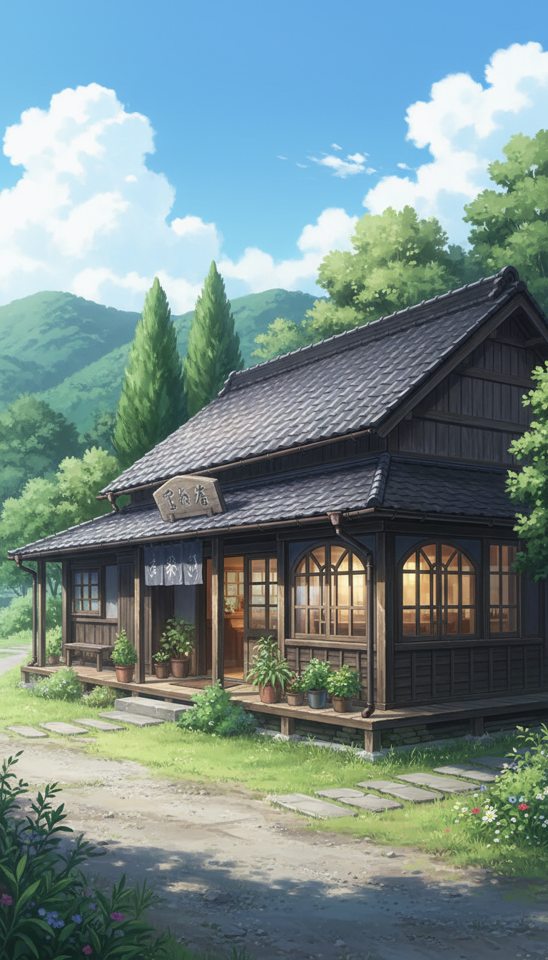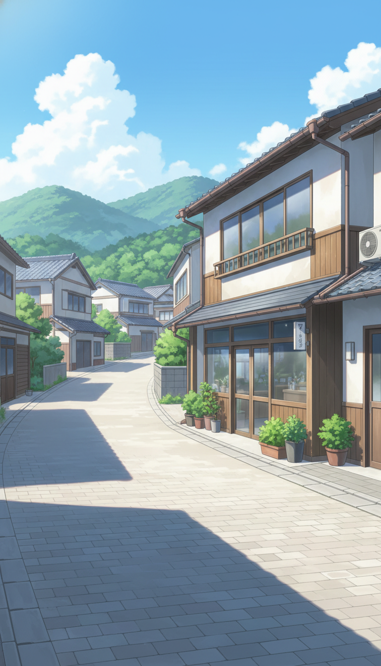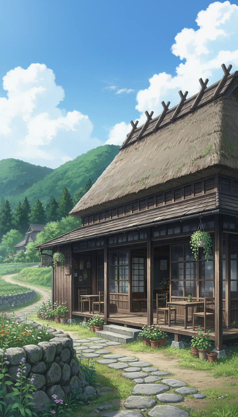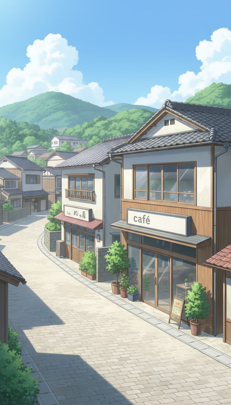 青空と山々を背景に、和の雰囲気が漂う街角のカフェを描いた爽やかな風景。
